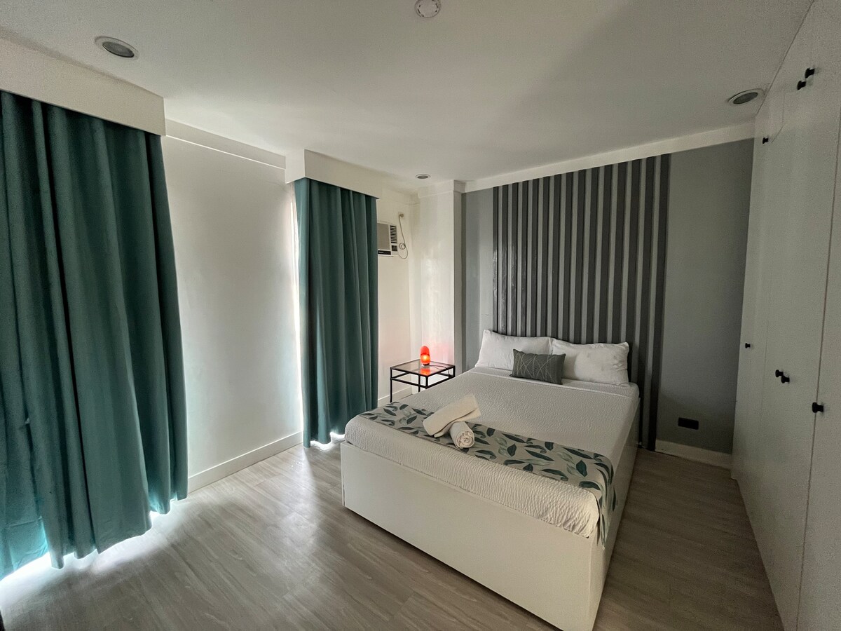 -對面SM城市商場(電影院、超市、商店商店、咖啡館、Anytime Fitness健身中心) - 2間臥室,配有露臺,茂密景觀。 - 1張雙人牀、1張全尺寸牀 -如有需要,最多可提供1張額外牀墊(提前通知) -可供4人免費使用泳池(超額200比索) (提前通知) (周一無法使用泳池) -提供付費停車位(每晚200比索。請提前通知) -寬帶WiFi -廚房 -洗衣機 -自助入住 -入住:下午3點 -退房時間:上午11點