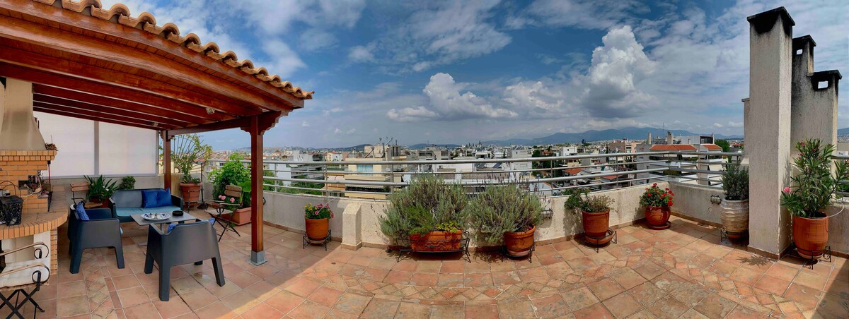 位於市中心,明亮舒適的30平方公尺頂樓單間公寓,配有大型私人露臺,可俯瞰雅典市和利卡貝圖斯山,享有獨特的雅典衛城景觀。非常適合週末度假、探索城市和遠程工作。 -步行15分鐘即可抵達Kolonaki區,這是雅典時尚的中心,有很多咖啡廳、餐廳和酒吧。 -步行25分鐘即可抵達憲法廣場和歷史悠久的市中心。 -距離迷你市場1分鐘路程。