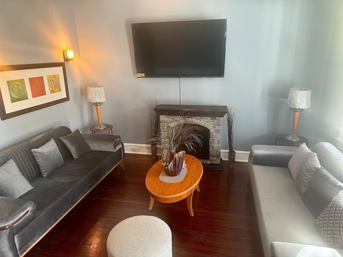 這間舒適的1床/1浴室1樓單位,2輛車車道。密碼鎖進入客廳,配有沙發床、辦公桌、椅子和50吋三星智慧電視。配備花崗岩櫃檯的廚房配備齊全,配備您所需的一切,以及一個早餐吧,可供您坐下用餐。花崗岩被運送到浴室盥洗台上,配有充足的櫃檯和抽屜空間,並配有設備。臥室配有雙人床、梳妝臺、衣帽間、智慧電視和電壁爐。滑動門通往院子,配有烤架和小酒吧套裝