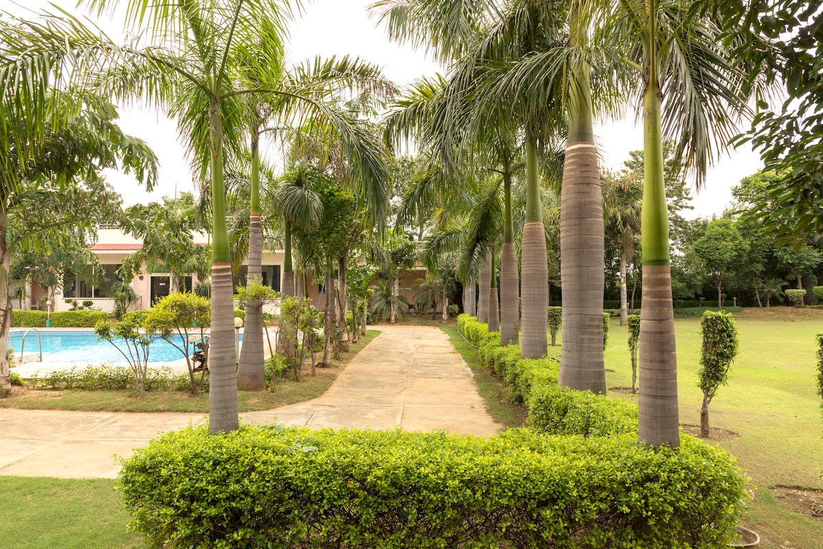 靠近阿拉瓦利山的私人豪華度假勝地,靠近城市但遠離污染,空氣更清新,空氣質素指數更低。 在鬱鬱蔥蔥的草坪上放鬆身心、在吊床上搖擺、在泳池中漂浮,並在清晨醒來欣賞寧靜的景色。 在綠色屋頂涼亭下,你可以盡情享受草坪遊戲、星光燒烤和優雅的夜晚,是戶外用餐、聆聽音樂和慶祝活動的理想之選。 適合親朋好友一同入住的寧靜度假勝地,讓你留下難忘的回憶。