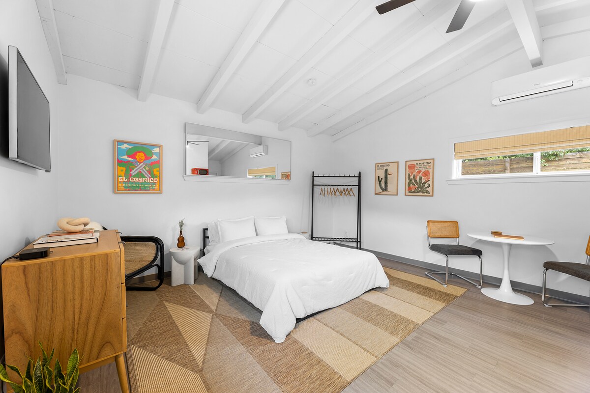 這間單間公寓是探索奧斯汀的完美起點。距離市中心、國會大樓和UT幾分鐘車程;坐落在迷人且安全的東側街區,步行即可抵達數十家餐廳、酒吧和咖啡店。 客用住房有自己的無鑰匙入口,擁有令人驚嘆的自然光,並配備全新的現代家具、定制小廚房和非常舒適、可定制的墨菲床。