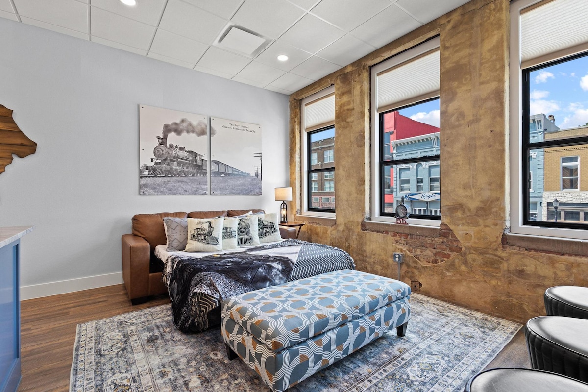 🚂 All aboard for a Downtown Denison stay This train-themed loft on historic Main Street is full of character 🛤️ Railroad-inspired decor + lofty ceilings 🛏️ King bed + queen sleeper sofa (sleeps up to 4) ☕ Coffee shop right next door + 🍺 brewery just behind the building, walk to shops and restaurants 📺 Stream your favorites, ☕ sip coffee, or just relax 🛍️ Right on historic Main Street