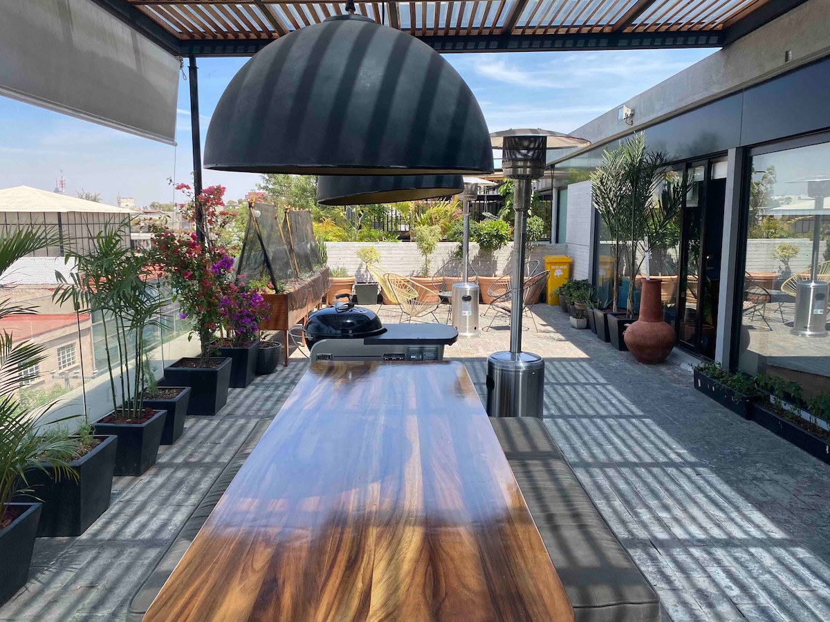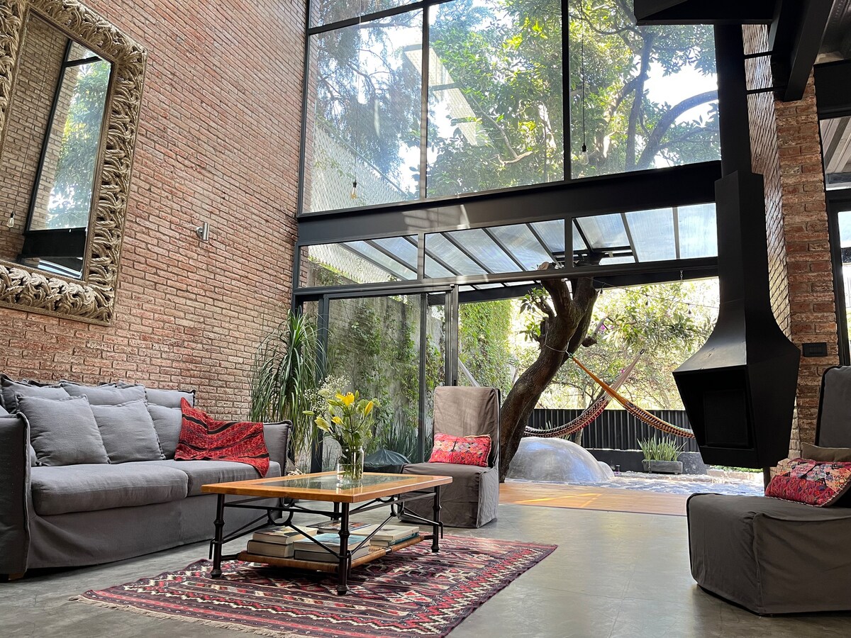 Amazing loft located at an old garment factory renovated as modern LEED apartment building. This building recycles all water and reuses it for the rooftop urban agriculture area. The loft furniture was carefully curated to make the area comfortable while stylish and enjoyable. The rooftop has a 360° view of CDMX, with direct view to the skyline of the Reforma buildings. The Santa María neighborhood is well connected to Polanco, the Airport, Chapultepec, Condesa, Juárez and the Historic Center.