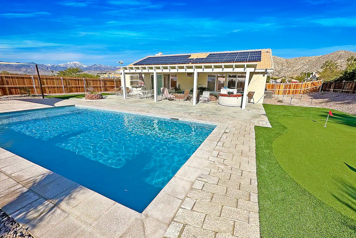 這間全新建造的豪華房源有 3 間臥室和 2 間衛浴,配備寬敞的窗戶,窗外是令人驚豔的景觀。房源內有溫水泳池和按摩池,讓你在星光下泡澡,還有專屬的健身空間。在 2 英畝的寬闊空間中,在你的私人綠洲下放鬆身心,非常適合觀星和露台聚會。在令人驚嘆的日出中醒來,探索約書亞樹的奇妙景象,然後回到沙漠中的天堂,享受舒適的泡澡時光。