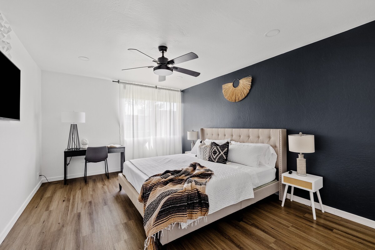 入住這間位處中心地段的單間公寓,享受這裡的時尚品味。這間寬敞的單間公寓非常適合情侶或獨行旅客入住。設備包括設備齊全的廚房、咖啡吧、智慧電視、WiFi、遊戲、可堆疊的洗衣機烘乾機,以及配有烤架和火坑的小露臺。步行即可抵達熱門餐飲目的地Little Miss BBQ、The Vig、Timo Wine Bar和Sushi Friend。 距離鳳凰城天港機場15分鐘,距離州立農場體育場25分鐘。