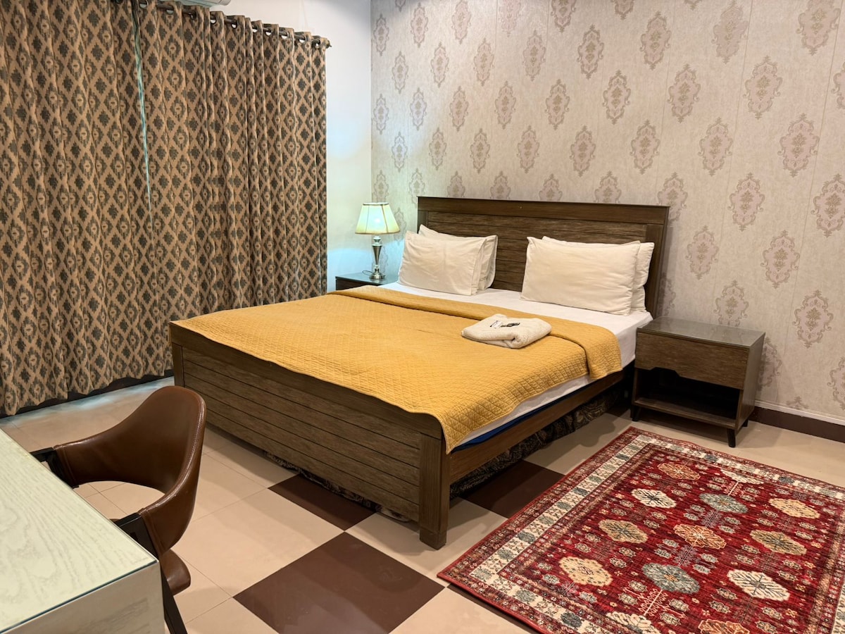 Modern, Cozy and Luxurious stay in Bahria Town Islamabad with Self-Check-in, Free Parking, Fast WiFi & Netflix enabled TV. Enjoy a King Bed, Private Balcony with Views and Seating, Kitchenette (Fridge/Freezer, Microwave and Electric Kettle), and stocked Bathroom. Breakfast and Room Service available upon request and charges. In-house café and restaurant available. Prime location near parks, malls & restaurants, just 12-15 mins drive from DHA2 and Giga Mall and under 1 hour from the airport.