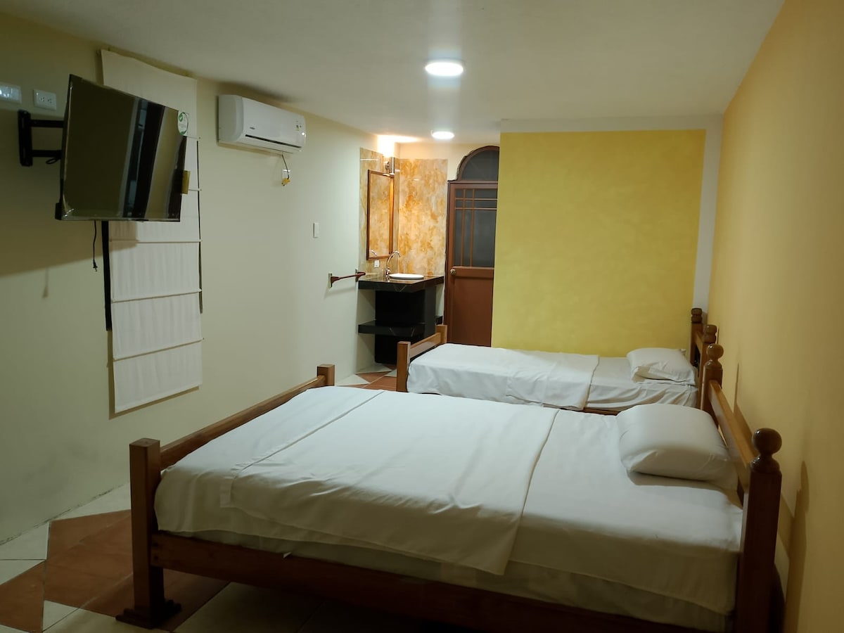 Habitación ideal para hasta tres personas, cómoda y práctica, perfecta para parejas, familias pequeñas o amigos. Cuenta con baño privado, aire acondicionado y acceso a los espacios comunes del hotel para descansar y disfrutar.encantará este adorable lugar para quedarte.
