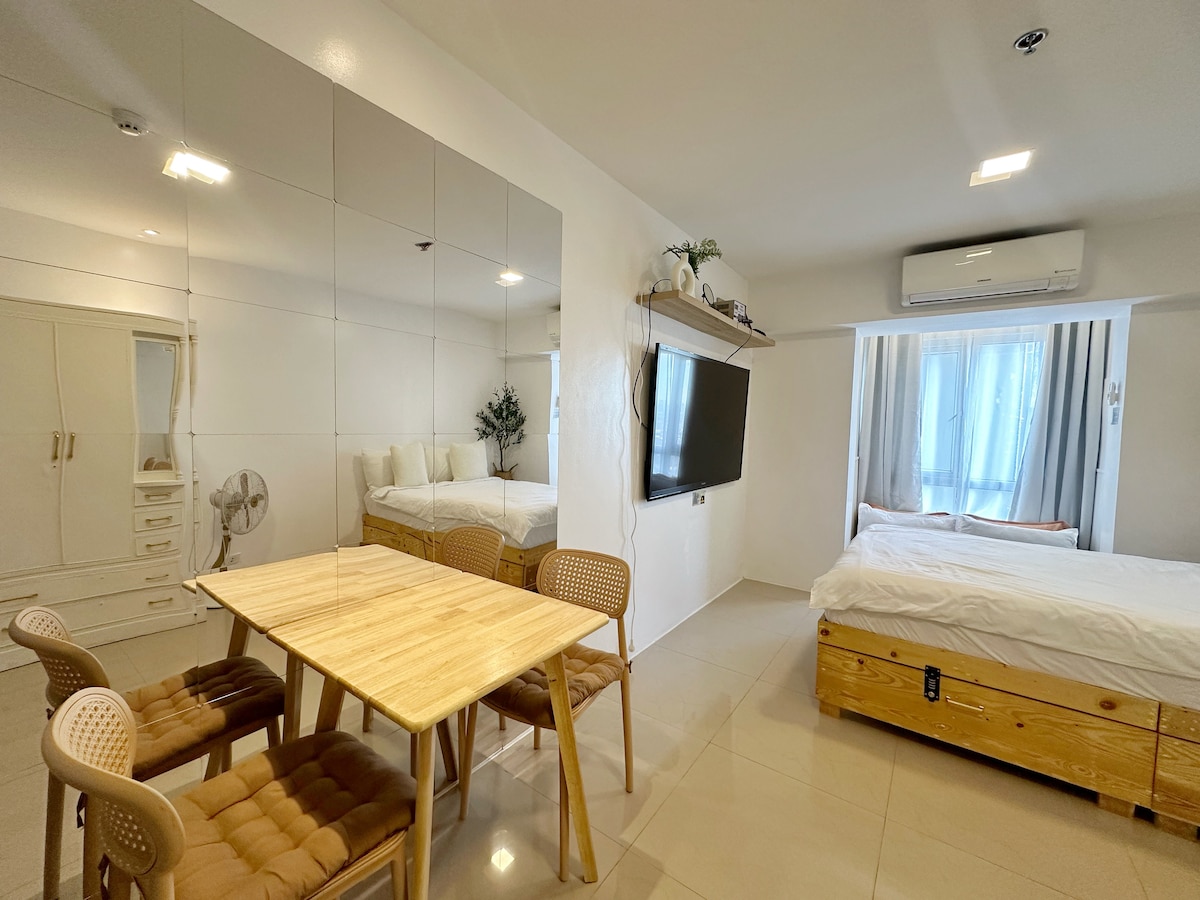 M Place @ South Triangle Tower D, Panay Ave.的現代熱帶風格單位。奎松市。享受高速互聯網、配有Netflix的智能電視、小廚房(不提供烹飪)和舒適的工作站。 位於充滿活力的商業中心,一樓設有雜貨店、銀行、餐廳、洗衣店和咖啡廳,非常適合在市中心放鬆而方便的住宿。