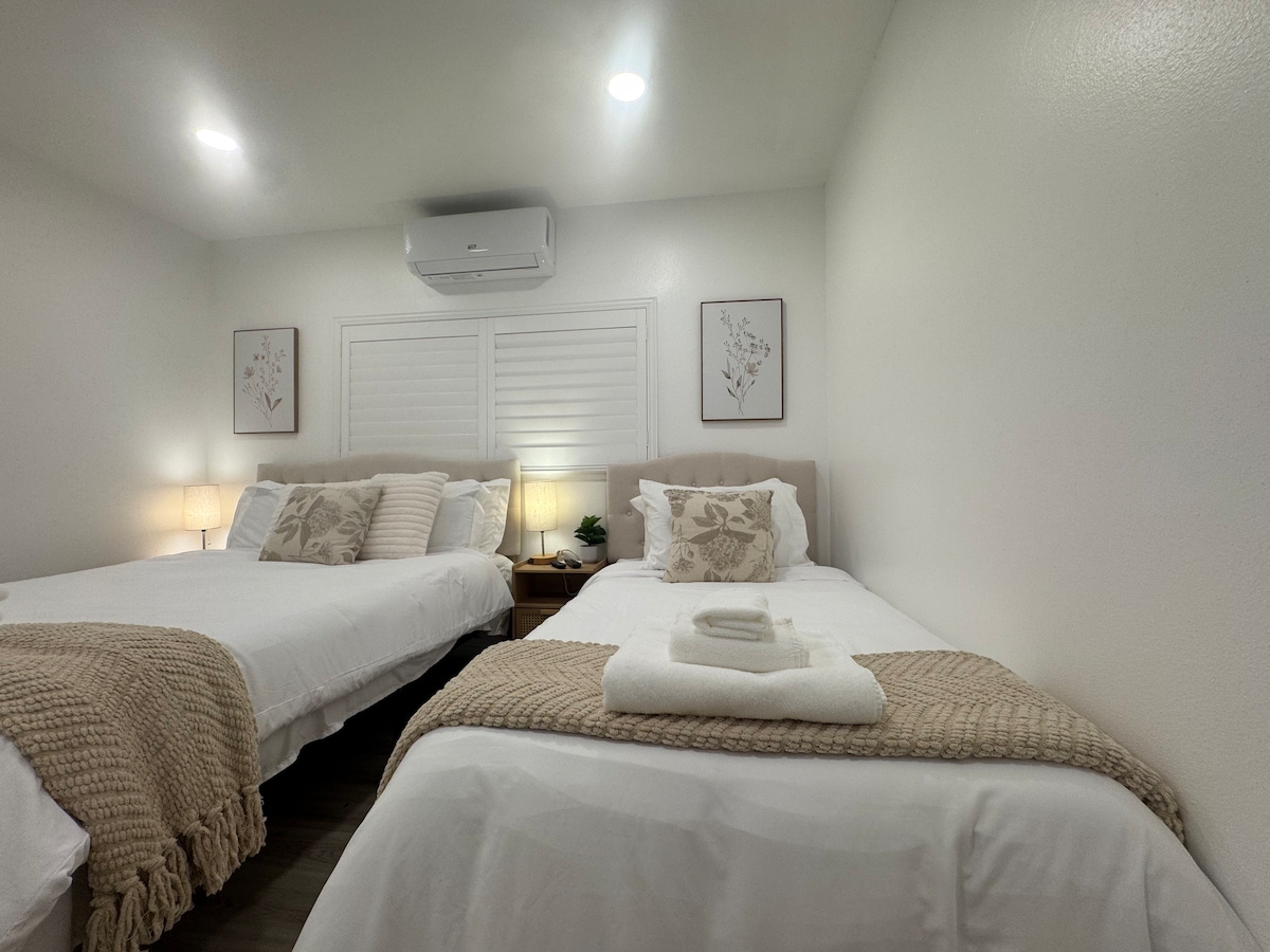 歡迎來到您的第二個家! 在南加州進行激動人心的冒險之後,在這間寬敞的客房中放鬆身心。 此房源經過優化舒適和隱私,擁有現代化的設備與服務和舒適的臥室。 主臥室包括一張雙人牀、寬敞的衣櫃和時尚的套房浴室。 第二間臥室配有兩張雙人牀,非常適合兒童和個人。 還有設備齊全的小廚房、舒適的客廳和私人後院。