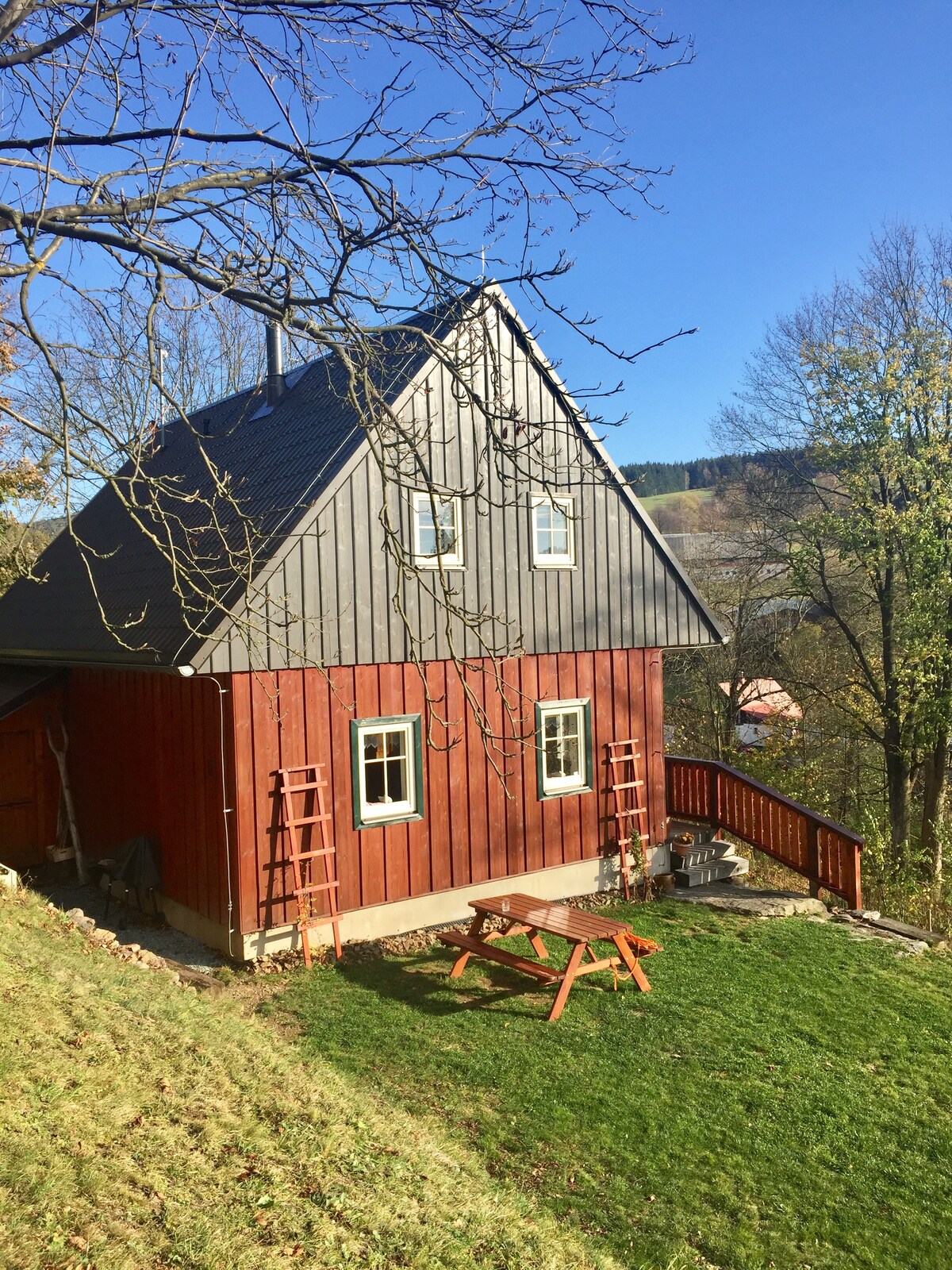 一間新建的牧羊人小屋,擁有不尋常的馬鞍屋頂,在大自然中一個安靜的地方,有一個共同的家庭,可以從牀上欣賞美麗的景色。 只能透過私人房源進入,因此您的隱私不受打擾。 周圍環繞著寬敞的樹林,步行即可抵達。我們會提供更多設備與服務: 座位、火坑、秋千 ✅ 我們計劃: 冷氣:7月 ✅ 浴缸附爐和露台 ✅