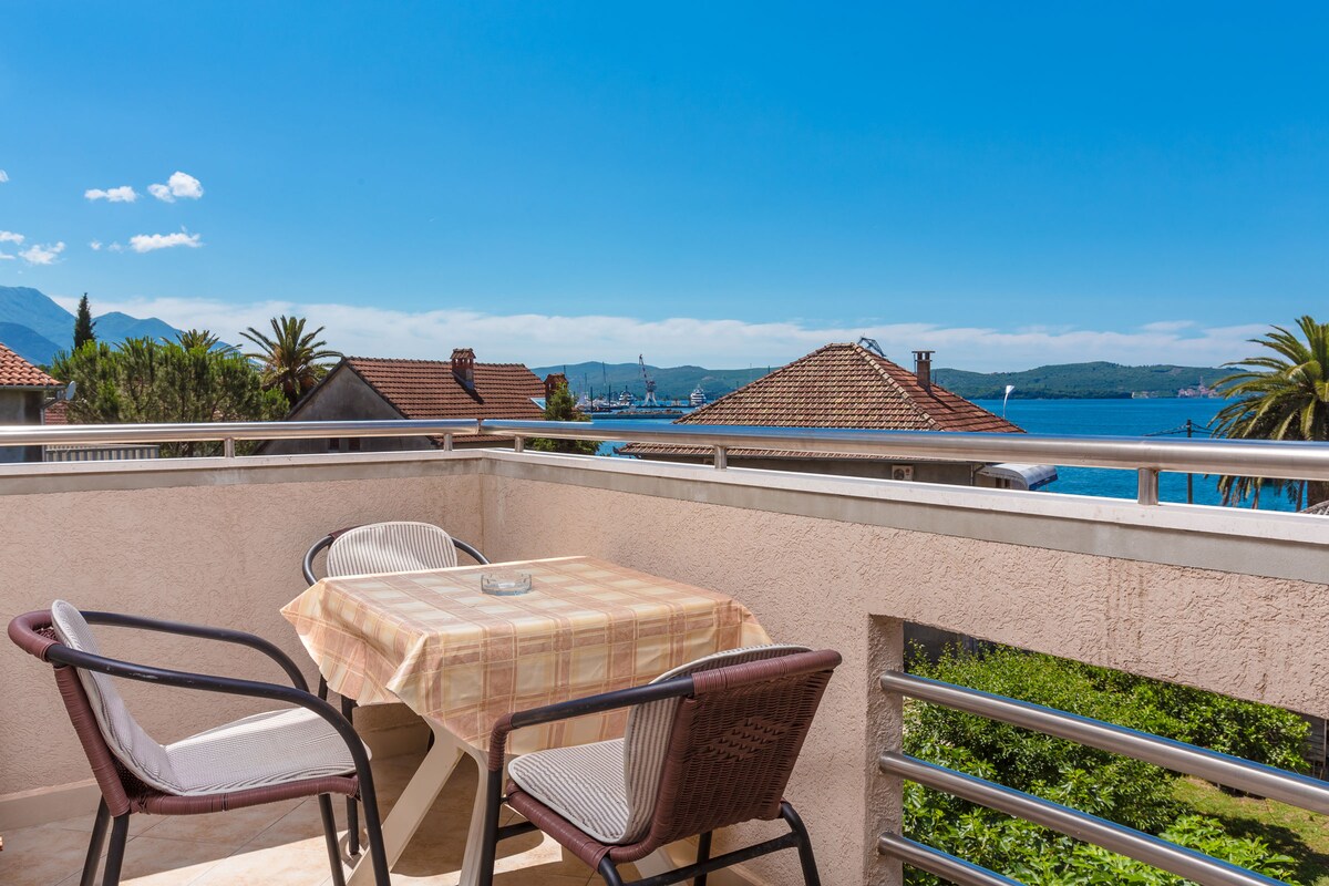Bright and cozy apartment in the heart of the Bay of Kotor. With stunning views of the sea and mountains. There is everything you need for a comfortable stay for both short and long term. There is a large double bed, 1 sofa bed and 2 chair beds, a full kitchen with appliances. One minute walk beaches, restaurants, shops, bakery, bus stop.