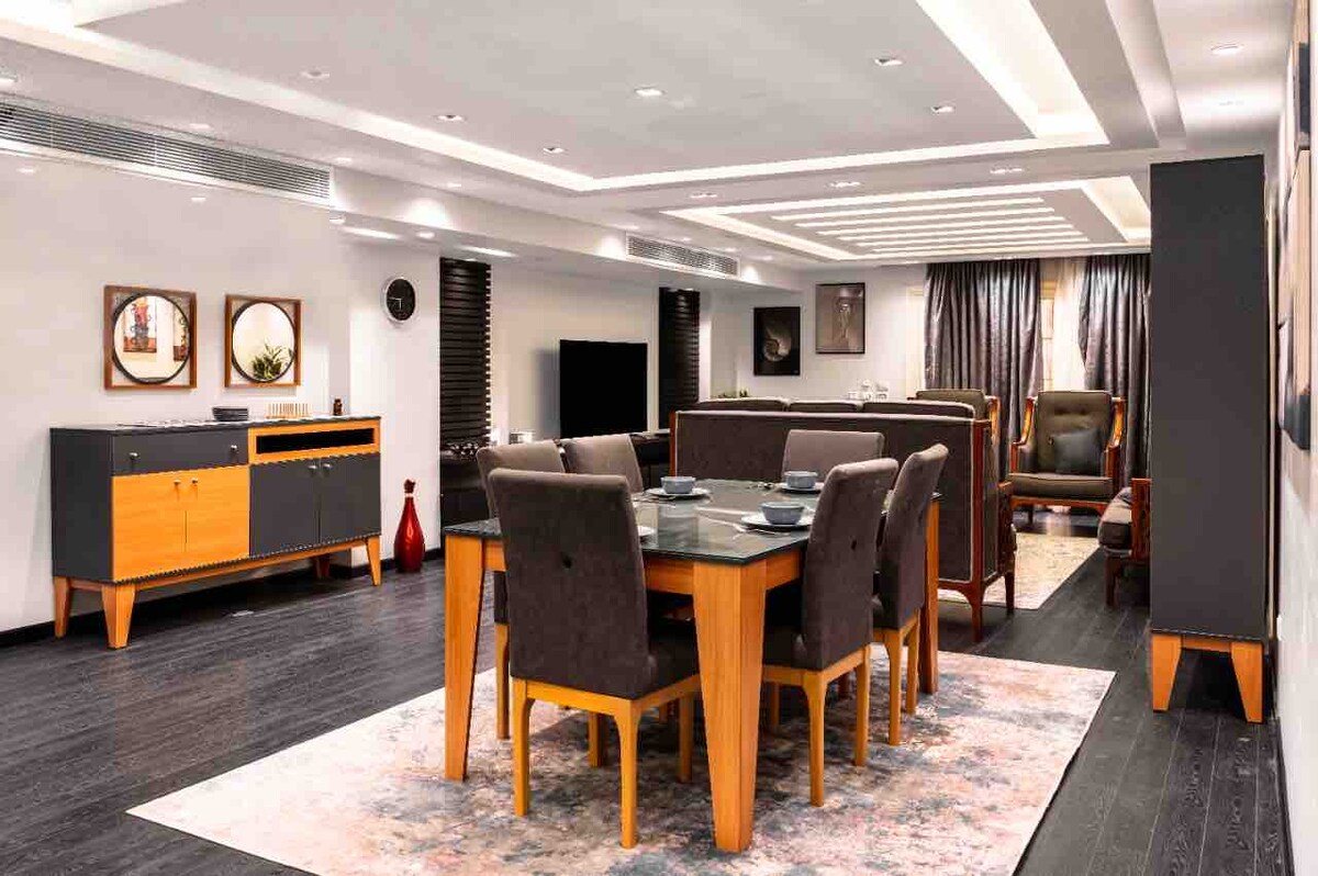 Experience luxurious living in the heart of Egypt! This chic, contemporary apartment is located near famous attractions such as the Pyramids, Sphinx, and Egyptian Museum, and surrounded by top-rated hotels like Four Seasons and Fairmont Nile City. Its modern interior design will provide the perfect setting for a relaxing and comfortable stay. Book now for an unforgettable experience in the heart of Egypt.