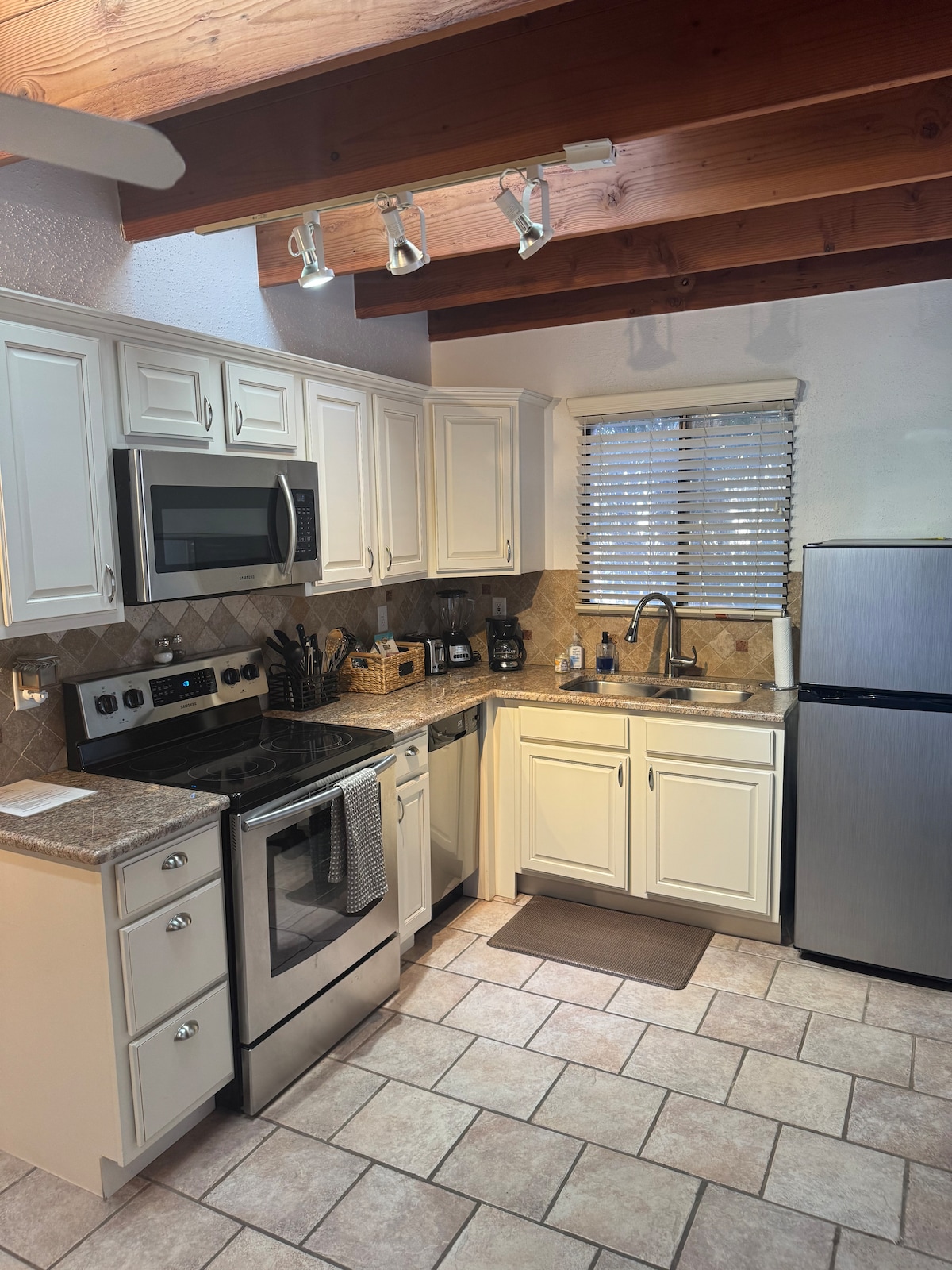 最近翻新的迷你屋,配有閣樓式臥室。在這個非常不尋常的拉斯克魯塞斯空間中,許多獨特的功能將迎接您。樓下有一間客廳,配有標準雙人沙發床和翻新的廚房,除了烤箱外,還有您需要的一切。全套4個爐頭的爐台、微波爐、全尺寸冰箱和飲食吧。有小辦公桌區域可工作、淋浴間(樓下)和美妙的小戶外空間。