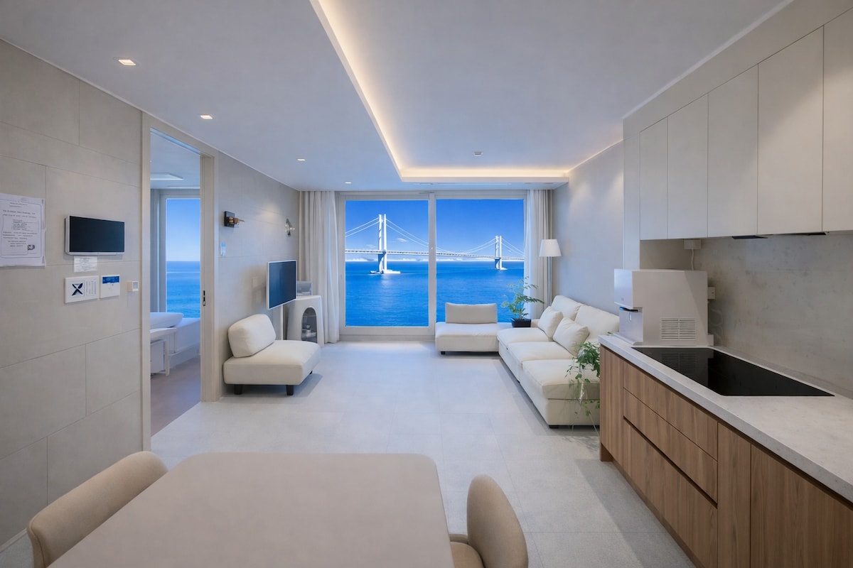 Ocean view with the best beauty in Korea !!! You can enjoy sunrise and sunset at the same time, and the clear air of your heart, the sound of the waves crashing on the rocks, the sea shining in the moonlight, the floating boats at night. Also, You can enjoy spa in the bathtub reminiscent of a pool villa, and the interior space made of hotel-grade materials. ๋ณธ ์์๋ ๋ฏธ์คํฐ๋ฉ์ ํน๋ก๋ฅผ ์ ์ฉ๋ฐ์ ๋ด๊ตญ์ธ ๊ณต์ ์๋ฐ ํฉ๋ฒ ์ ์ฒด๋ก ๋ฑ๋ก๋์ด ์ด์๋๊ณ ์์ต๋๋ค