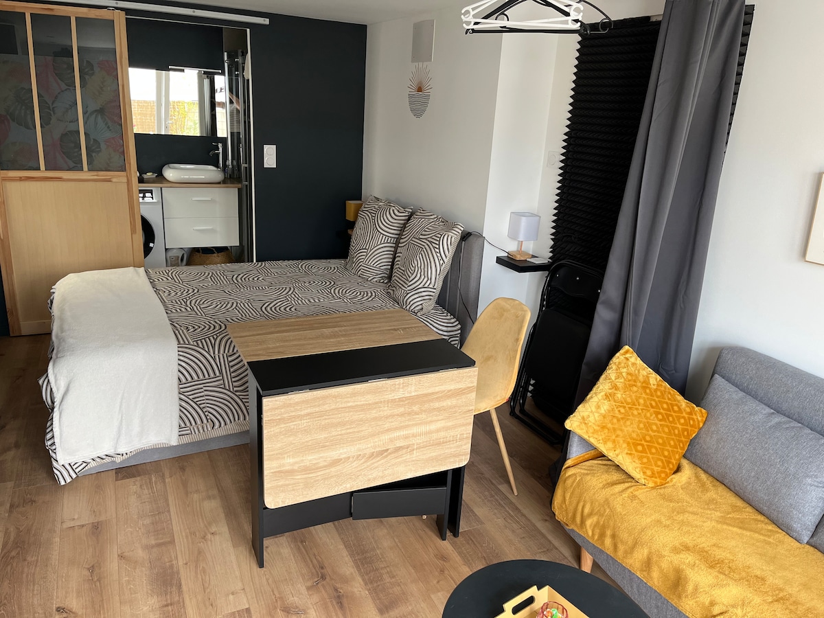 一樓的單間公寓,免費街邊停車位和朝西的私人花園區域。 全新優雅的團隊:小廚房、獨立浴室、1張雙人牀和沙發牀、更衣室、電視、Netflix、Wifi、洗衣機、電磁爐、房東2非常舒適,最多3人,最多3人,最多1隻寵物。安靜安全,步行9分鐘即可抵達多爾多涅河沿岸的綠道。 中世紀歷史中心,餐廳、博物館、充滿魅力的非典型景點。