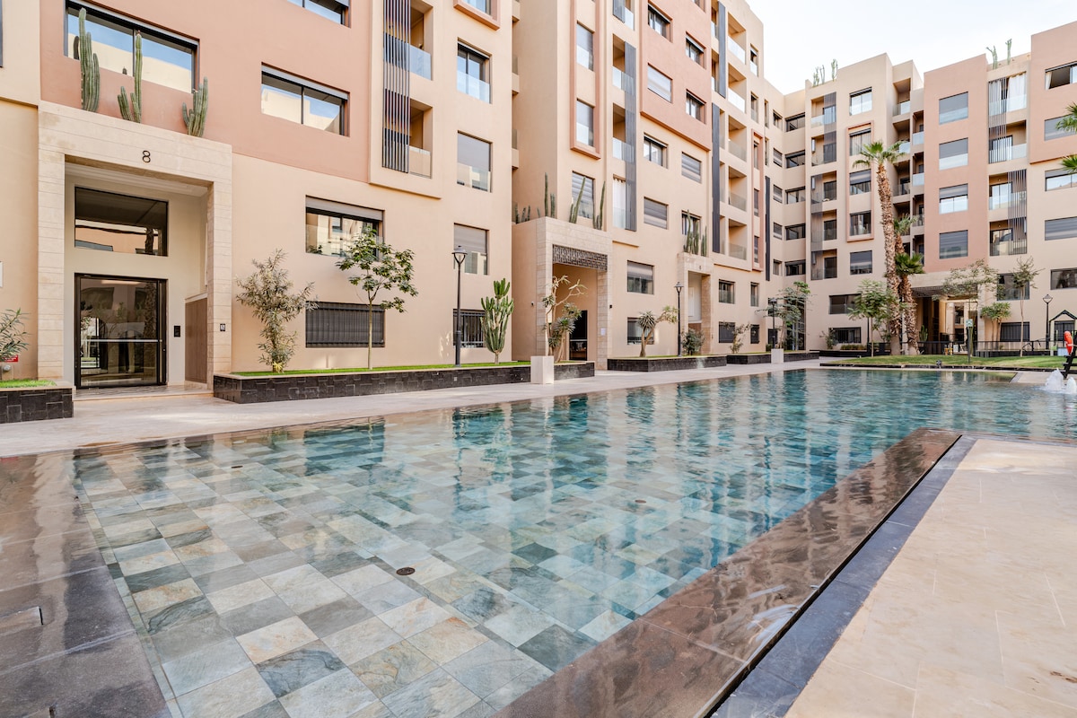 這套時尚、寬敞、明亮的兩房公寓設有兩個露台,為你的住宿提供舒適的環境。 公寓包括一間配有智能電視的漂亮客廳、一間設備齊全的廚房,以及兩間佈置精心的睡房。 位於一個設有泳池和健身室的安全住宅內,非常適合情侶、家庭或一群朋友前來放鬆身心。 距離 M Avenue 4 分鐘車程,距離市中心和機場 10 分鐘車程,距離 Jemaa el-Fna 也只有 15 分鐘車程。