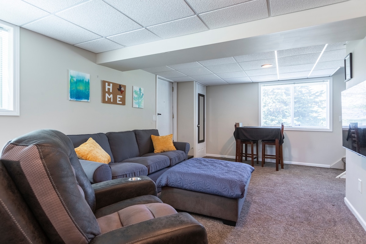 我們舒適、安靜的家,背靠步道、小溪和草原。 輕鬆前往州際公路、餐廳和商店。 您可以獨自使用我們的地下室,配有睡房、客廳、浴室和小廚房,以及棋盤遊戲、書籍、乒乓球、後院和附近的公園。 睡房有一張加州特大床和深色、涼爽的睡眠。 家庭房包括兩張單人牀和一張地板上的雙人牀墊,以及我們舒適的大沙發和落地窗,展示我們的綠色空間。