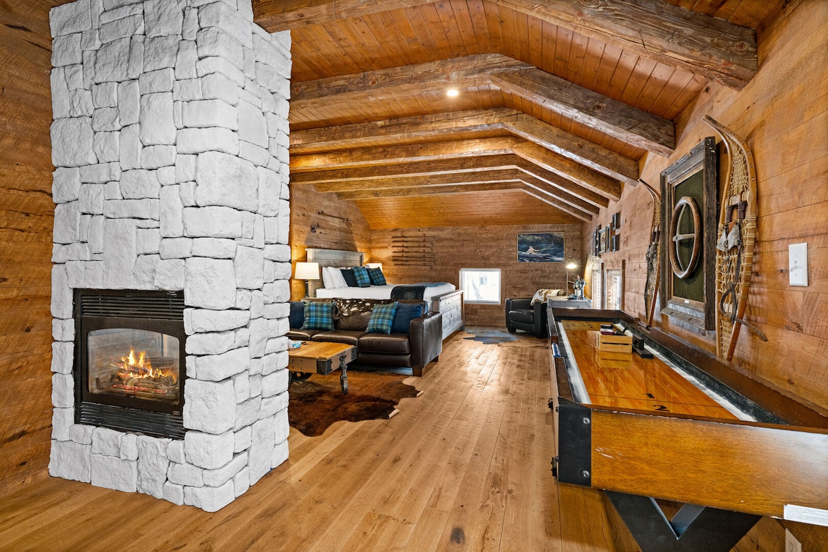 Indulge in the ultimate relaxation in the Billiards Suite, a luxurious 1,100 sqft 2-bedroom retreat that captures the essence of lounge-inspired living. Each bedroom offers the comfort of a king-sized bed, while the living area boasts a large sectional couch, perfect for lounging in front of the massive 85-inch TV. Warm up by the fireplace or whip up a gourmet meal in the full chefs kitchen; this suite is designed to cater to every whim.