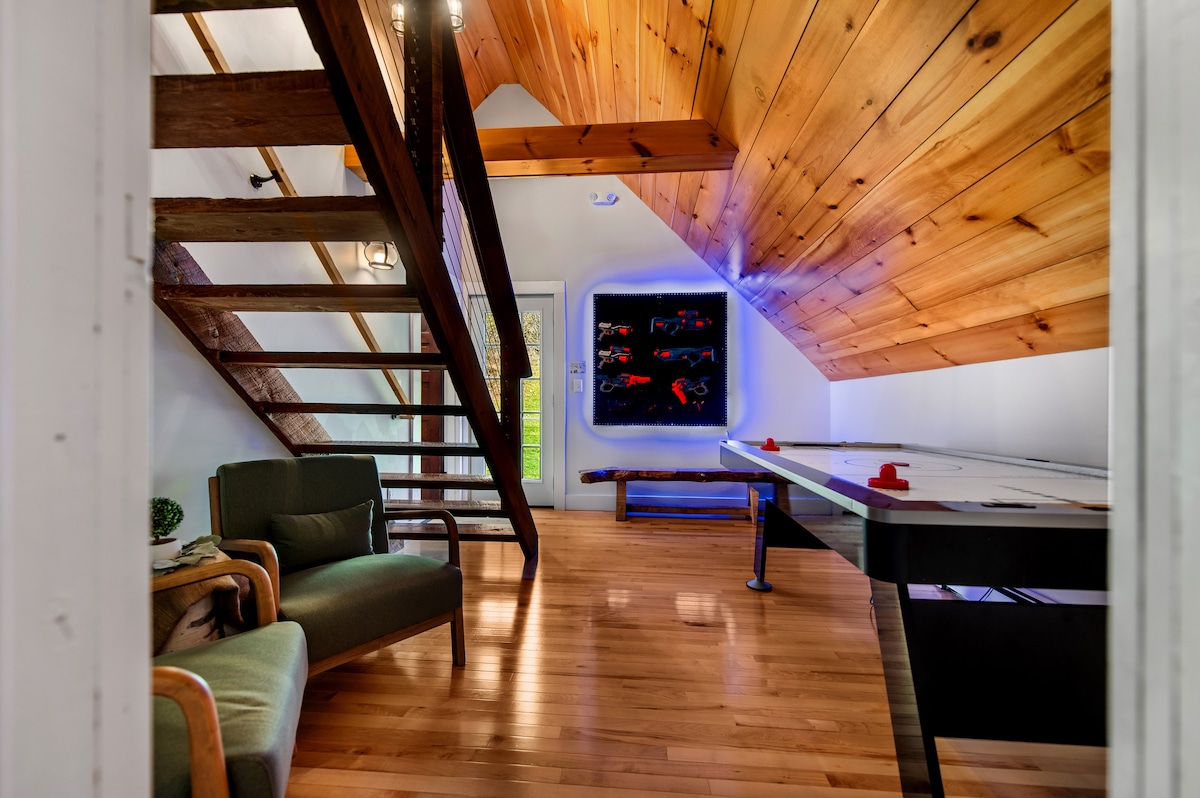 歡迎來到 HYGGE HOUSE,這是一個豪華的現代度假勝地,位於 Stratton 的 4 英畝林地上。這間房源的設計靈感來自丹麥的「hygge」概念,體現了溫暖、舒適和幸福感。全年皆可在私人按摩浴池、三溫暖中放鬆身心,甚至還有樹屋,讓您享受終極山間度假。這座建築瑰寶距離斯特拉頓和雪山度假村僅幾分鐘路程,是放鬆和探險的天堂,擁有開放式樓層、舒適的壁爐和大窗戶,讓您與大自然連接。