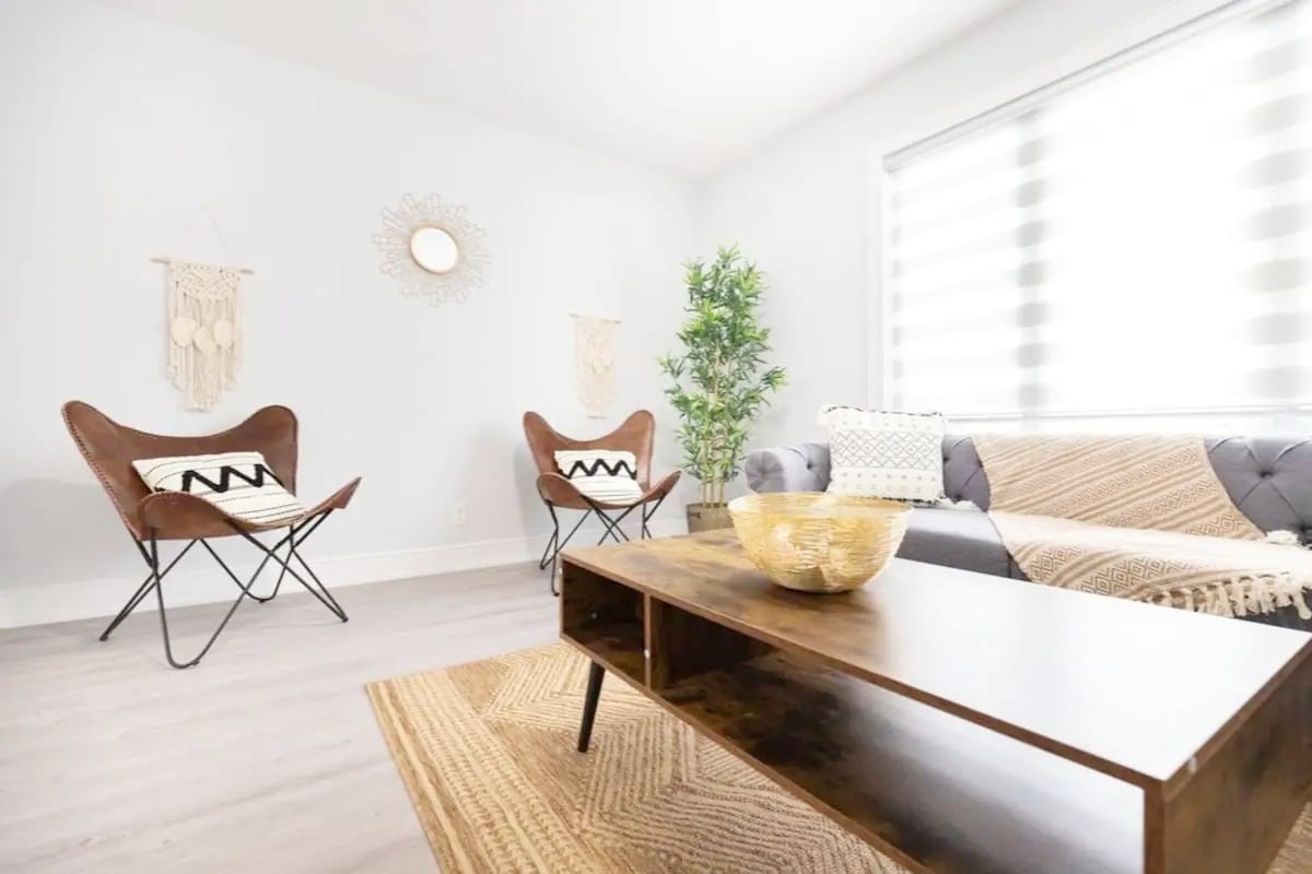 我們舒適的整個地下室單位提供寬敞的客廳,配有50英寸超高清智能電視和一張沙發牀。 免費千兆WIFI。兩間臥室配有1.8米寬雙人牀和大衣櫃。 餐桌和四把椅子。 專用工作空間,配有辦公桌和椅子。 設備齊全的廚房,配有爐竈、冰箱、空氣炸鍋和微波爐、配有洗衣機和烘乾機的私人洗衣房。 免費路邊停車(車道可用於冬季過夜停車)