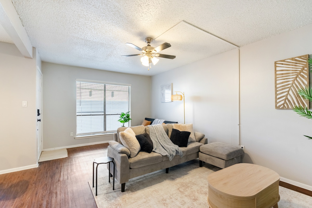 歡迎來到我們舒適的1牀、1浴室的德州主題公寓! 這個空間擁有復古德州裝飾和充滿活力的德州驕傲,提供舒適和魅力。 享受放鬆的起居空間,配有80英寸電視、設備齊全的廚房和豪華加大雙人牀,讓您安心入住。 現代化的浴室配備所有必需品,公寓距離當地景點和市中心僅幾分鐘路程。 非常適合週末放鬆身心或長期住宿,是探索德州奧斯汀嬰兒的理想大本營!