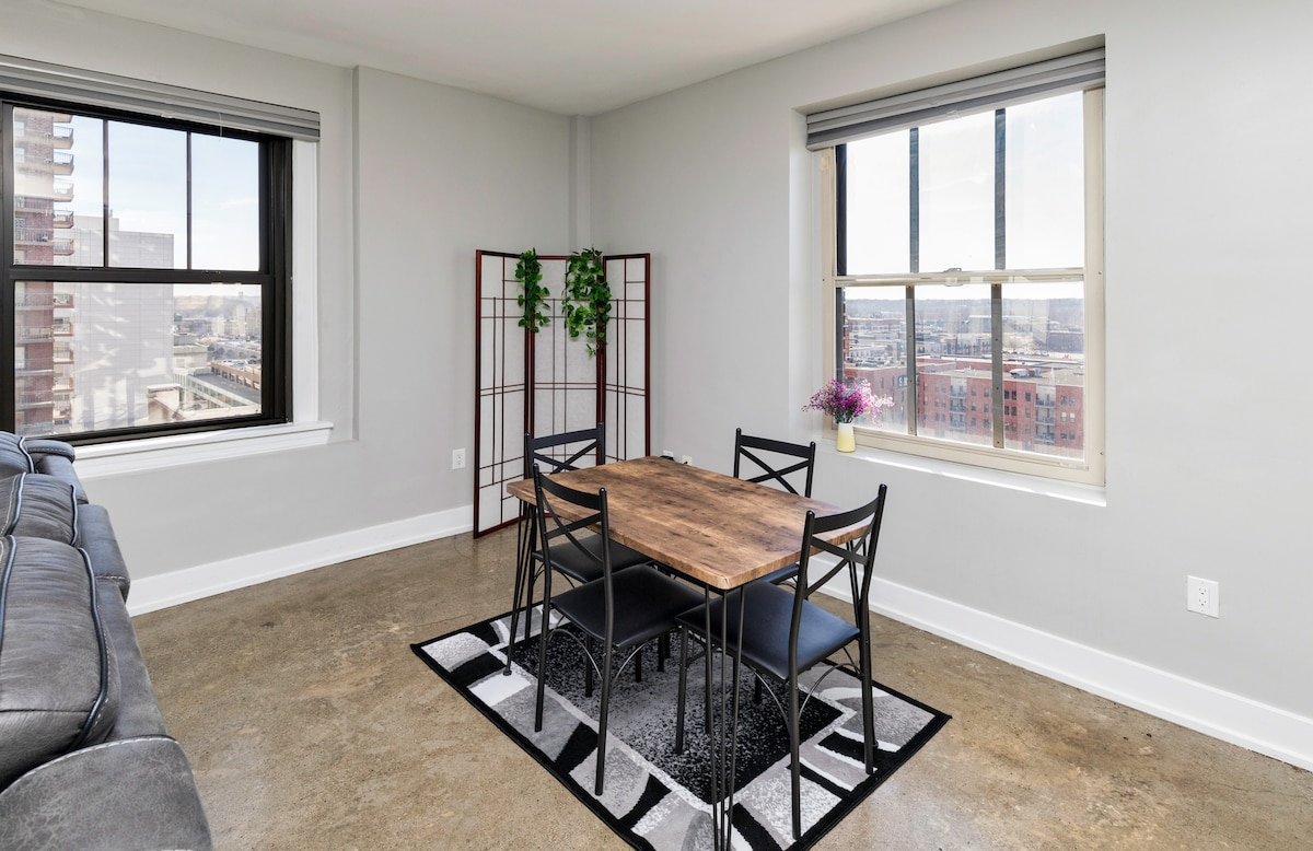 A quiet, light-filled top-floor studio perched above downtown Des Moines. Set in a beautifully preserved historic building, this 12th-floor space offers soaring ceilings, skyline views, and a peaceful atmosphere that feels like your own private retreat in the city. Perfect for travelers craving a cozy, well-designed home base, the space blends modern comfort with timeless character. Steps away from all downtown has to offer — yet high enough above the noise to feel truly restful.