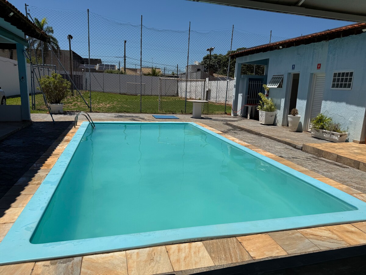 Leve toda a família a este ótimo lugar com muito espaço para se divertir. 1 banheiro ,1 chuveirão externo . 1 quarto :5 cama solteiro ,1cama casal,1 colchão casal extra, ar condicionado ,ventilador ,rack Área com ventilador de parede, 3 cadeiras áreas , churrasqueira, wi-fi ,. piscina com led ,cascata , hidromassagem . (Possui no local ufuro mas uso somente dos anfitriões).proibido uso para hóspedes. 2 mesas mármore 5 jogos de mesa. não tem espaço degaragem,local seguro tem câmeras