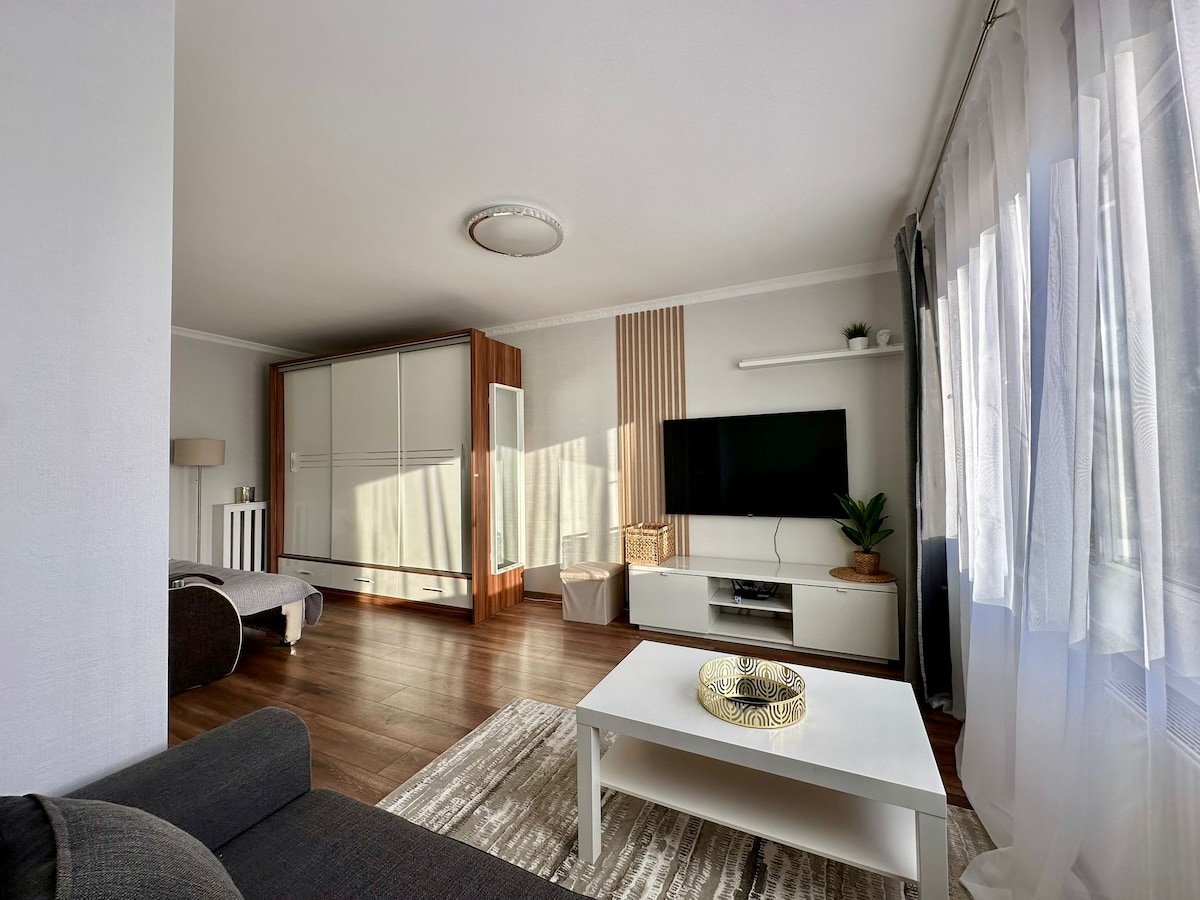 公寓內有一間臥室和寬敞的客廳。帶廚房的客廳是漫長一天後放鬆身心的完美去處。 陽臺/露臺非常適合晨茶或咖 啡。位於新開發的商業區域 開車10分鐘即可抵達市中心,步行10分鐘即可抵達巴士或電車站。 公寓附近還有餐廳、商場和兒童遊樂場。 公寓適合情侶、有小孩的家庭和朋友入住。
