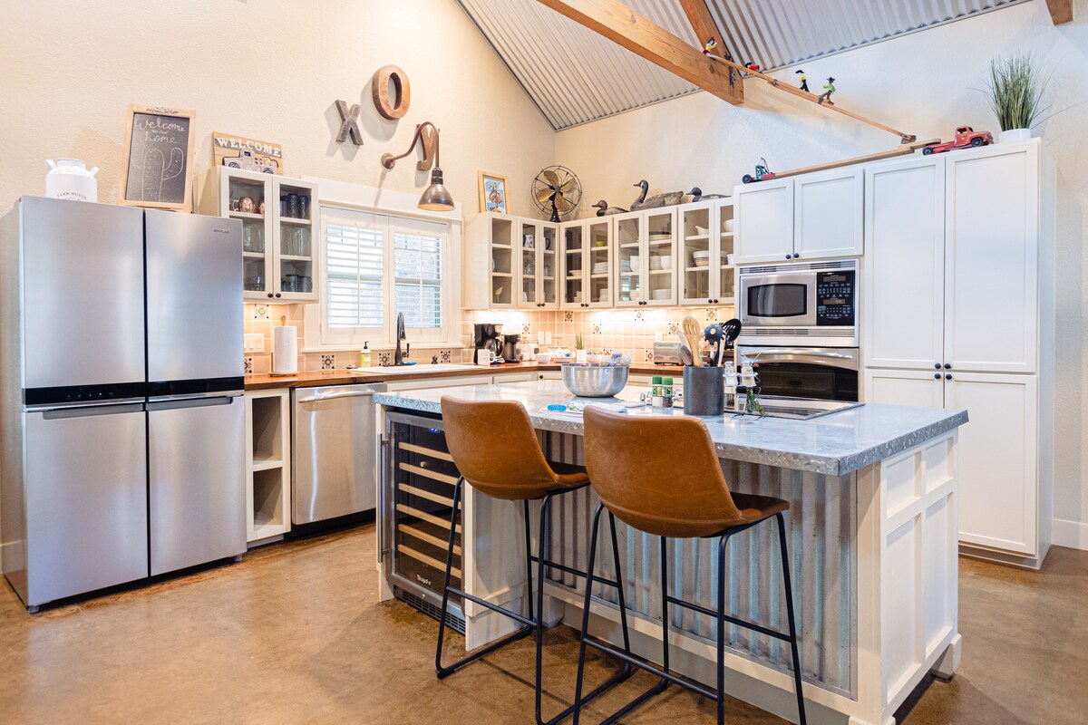 這個定制的德州農場房源位於Dripping Springs市中心,距離我們繁華小鎮的購物和用餐地點只有幾步之遙。這個房源有大型開放式樓層和大型後門廊,為您的家庭提供了充足的空間,讓您可以盡情享受家庭時光。後門廊是一個室外有頂棚的起居空間,配有壁爐、電視和長桌,可供閒逛。此外,後院還有洗衣坑和遊樂場,為所有年齡層的人提供娛樂。