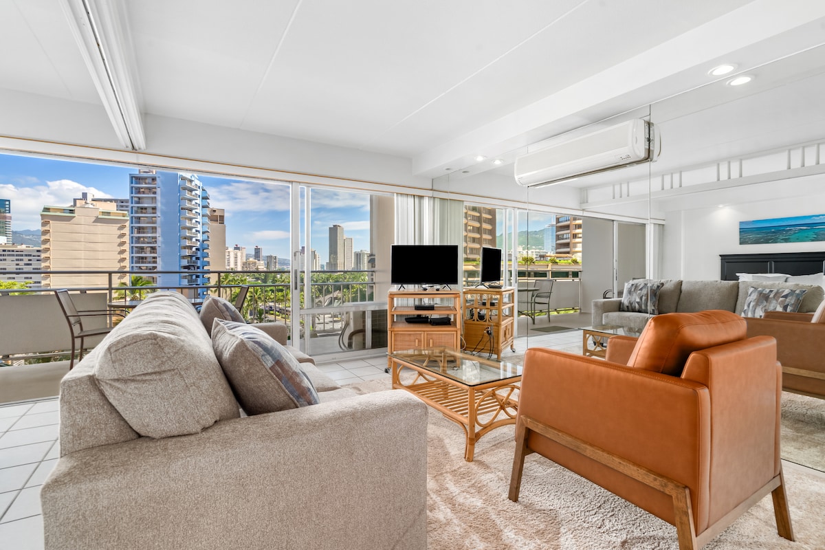 這間美麗的單臥室公寓位於Ilikai ,是一片小綠洲,從陽臺到配有LED燈的手工天花板,可欣賞壯麗的景色。 您將擁有住在海灘小屋的氛圍,但舒適的廚房、浴室、標準雙人牀、單人牀和一張沙發。 請注意,部分燈光開關旁邊設有調光桿,請在確認燈光無法正常運作之前將調光桿調至最高位置