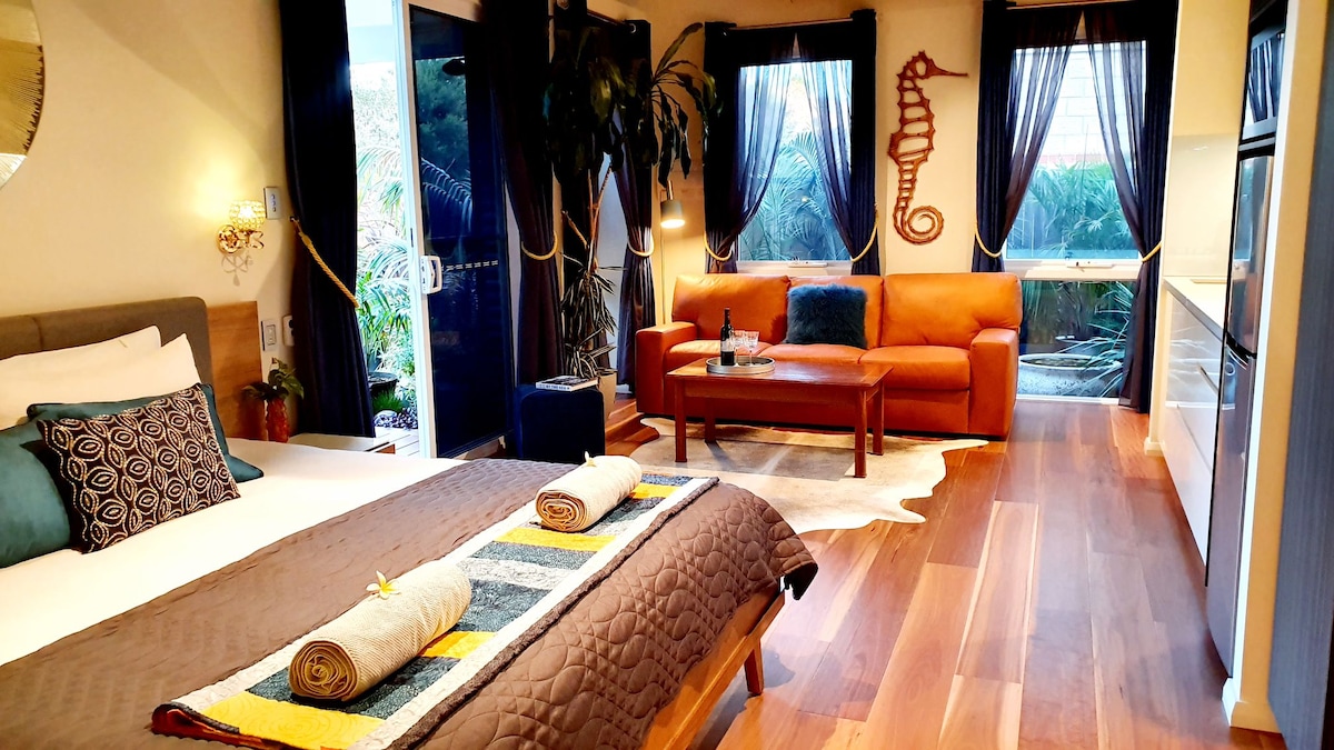 單間公寓距離城鎮和海灘300公尺,與主屋相連,但完全獨立,有自己的入口和庭院。單間公寓有1間標準雙臥室、1間套房浴室、1間小廚房和1間休息室/諮詢空間。有反式循環空調、WiFi和電視。私人庭院有自己的戶外環境,非常適合存放自行車和衝浪板。有陰涼的街邊停車位,前門鑰匙可從單間公寓入口的密碼鑰匙盒取得。