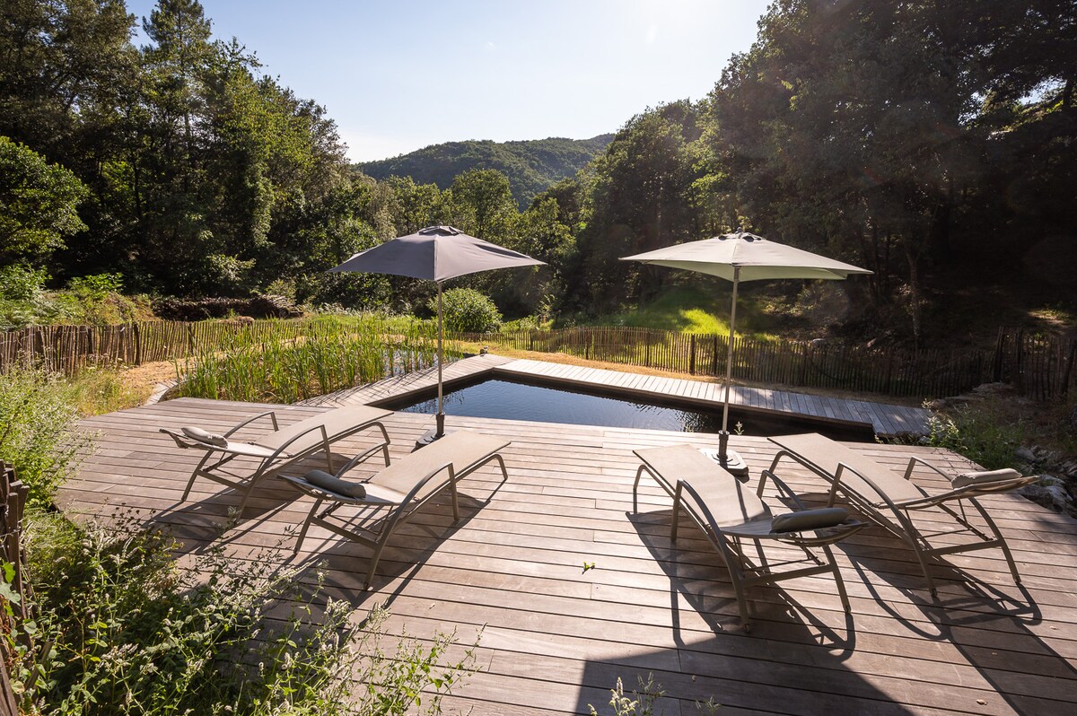 這座古老的塞文諾爾 (Cevenol) 房屋位於聖伊波利特堡 (St Hipployte du Fort) 和拉薩爾 (Lasalle) 之間,經過全面翻新,既有品味又舒適。它坐落在 3 公頃的寧靜森林中,南面有一個舒適的露臺,您可以在這裡用餐、午睡、喝開胃酒,同時在夏季廚房烤肉。我們最近在房子下方開闢了一個天然游泳池。