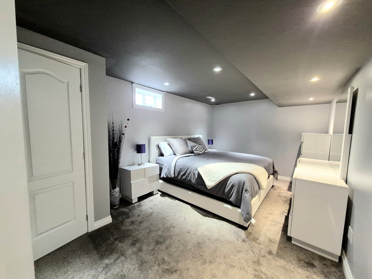 合法地下室-這個時尚的地方最多可容納5位客人,並配備齊全。有2間臥室,每間可容納2位房客,客廳還有1張日光浴床,可供第5位房客使用。一間臥室提供一張雙人床,另一間則提供一張雙人床。此外,有2張書桌和椅子,每間臥室各有一張,客廳有一張。精心設計的廚房擁有現代化和豪華的風格。時尚的浴室配有立式淋浴間。