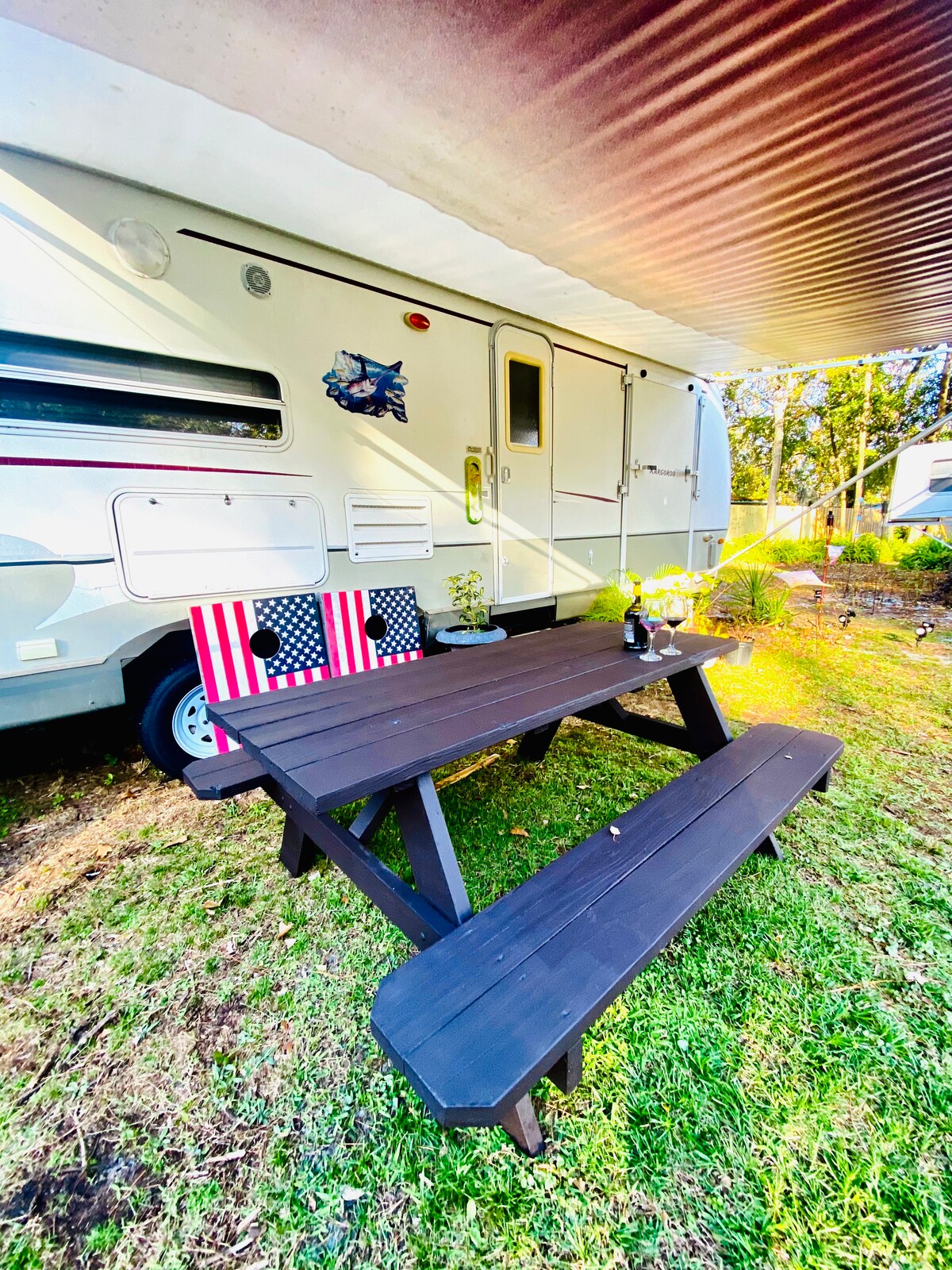 逃離這個大自然環繞的寧靜住宿!這款舒適的露營風格的露營車配備了放鬆度假所需的一切,包括夜間營火的火坑、戶外烹飪的烤架、野餐桌和有趣的玉米洞遊戲。這個獨特的房源結合了戶外自然與便利性,距離Oakleaf Town Center 5分鐘,您可以在那裡找到餐廳、雜貨店(如Publix)、酒類商店、超級目標、有趣的地方(如泡泡茶店)等!立即預訂!🪵