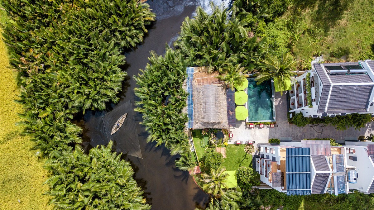 私人4間臥室別墅,可欣賞迷人的河景和花園景觀, 20米泳池,位置優越,靠近會安「古鎮」和東海海灘。 房價包括早餐、每日客房清潔、洗衣服務和高速WiFi! 紅橋餐廳就在隔壁。