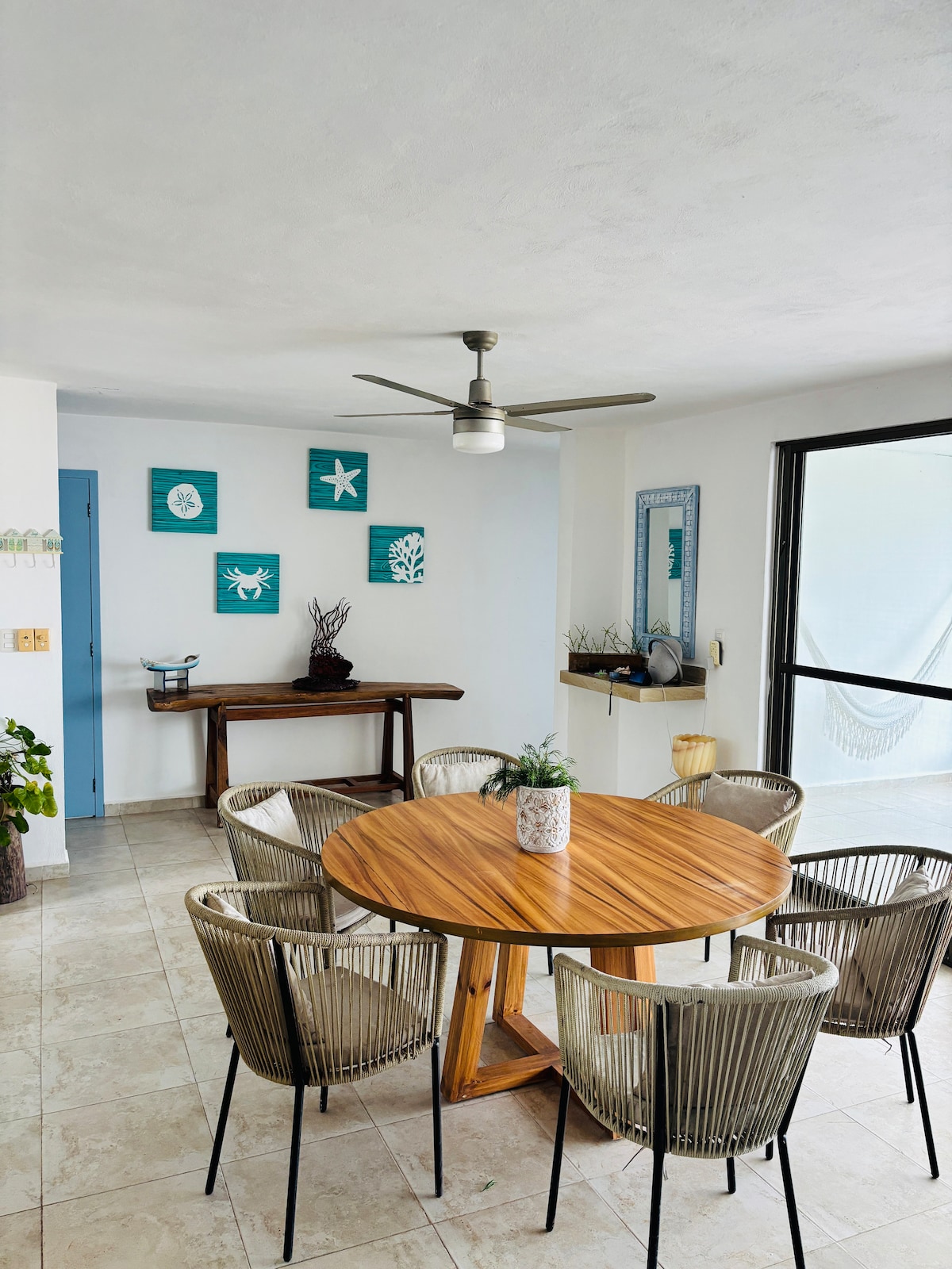 PONTÓ ,擁有波西米亞風格的裝飾和180度景觀的露臺。位於三樓(短樓梯) ,可欣賞最美麗的日落。 海灘上由12個單位組成的建築羣的一部分;外面有停車場、泳池、桌椅,可享受美麗的滿月之夜。 該地區有:海灘俱樂部、餐廳和便利商店。 有3間臥室; 2間配有獨立浴室,通風良好,光線充足,設備齊全,讓您度過難忘的旅程。