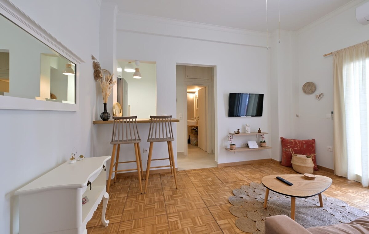 這間藝術和時尚的公寓融合了雅典傳統60年代的住宅和現代舒適,祝您住宿愉快! 這個空間位於時尚而充滿活力的Kypseli區域,設有豐富的浴室、帶柔和燈光的豪華臥室、帶55英寸電視的舒適休息室和設備齊全的現代化廚房。 距離頂級餐廳、購物和文化景點僅幾步之遙-聖喬治廣場、電影院、酒吧、Zara、公園。 超級方便的地鐵(紅線和綠線)/透過應用程式前往巴士和送餐服務,完全方便。