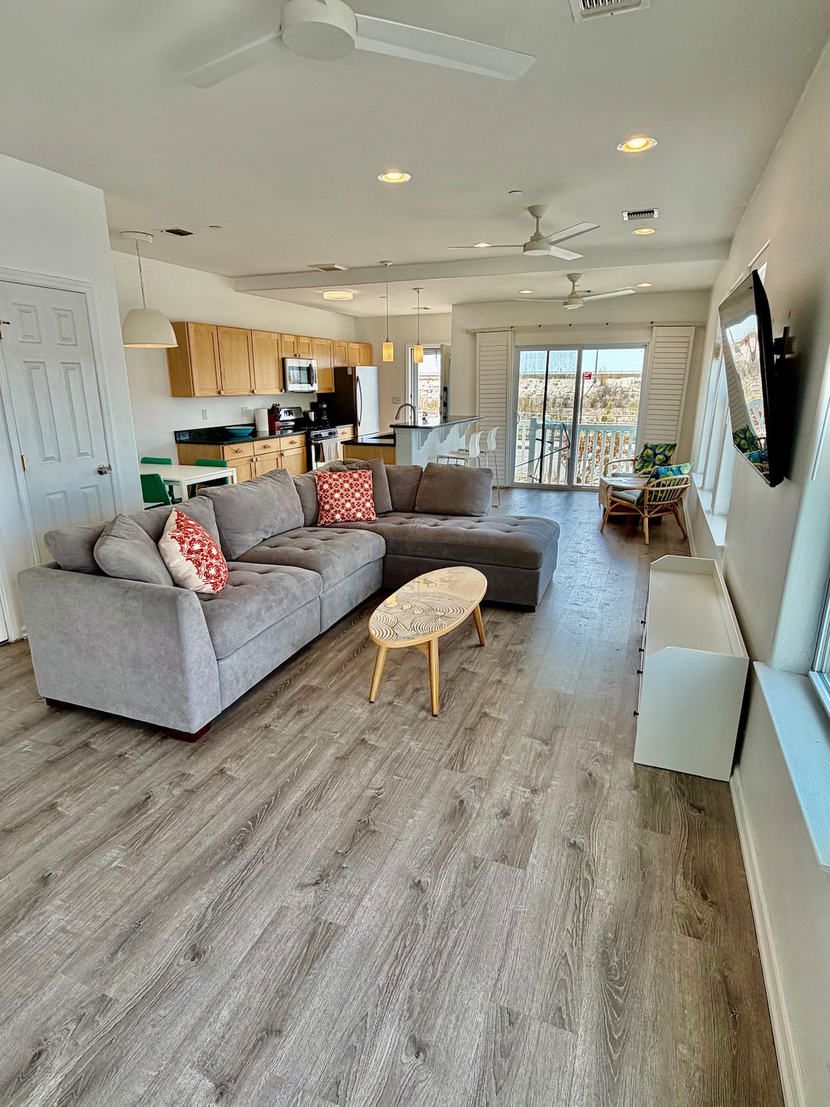 Steps to the beach! Park your cars and leave them behind while you live the beach life. Walk to the beach for a morning swim, come home for lunch then back to the beach for a nap. Head back for a cocktail, wave watching and sunset on your private upper deck. Walk down the street to a myriad of restaurant choices. Return home, open the windows and listen to the waves crash. Repeat as needed.