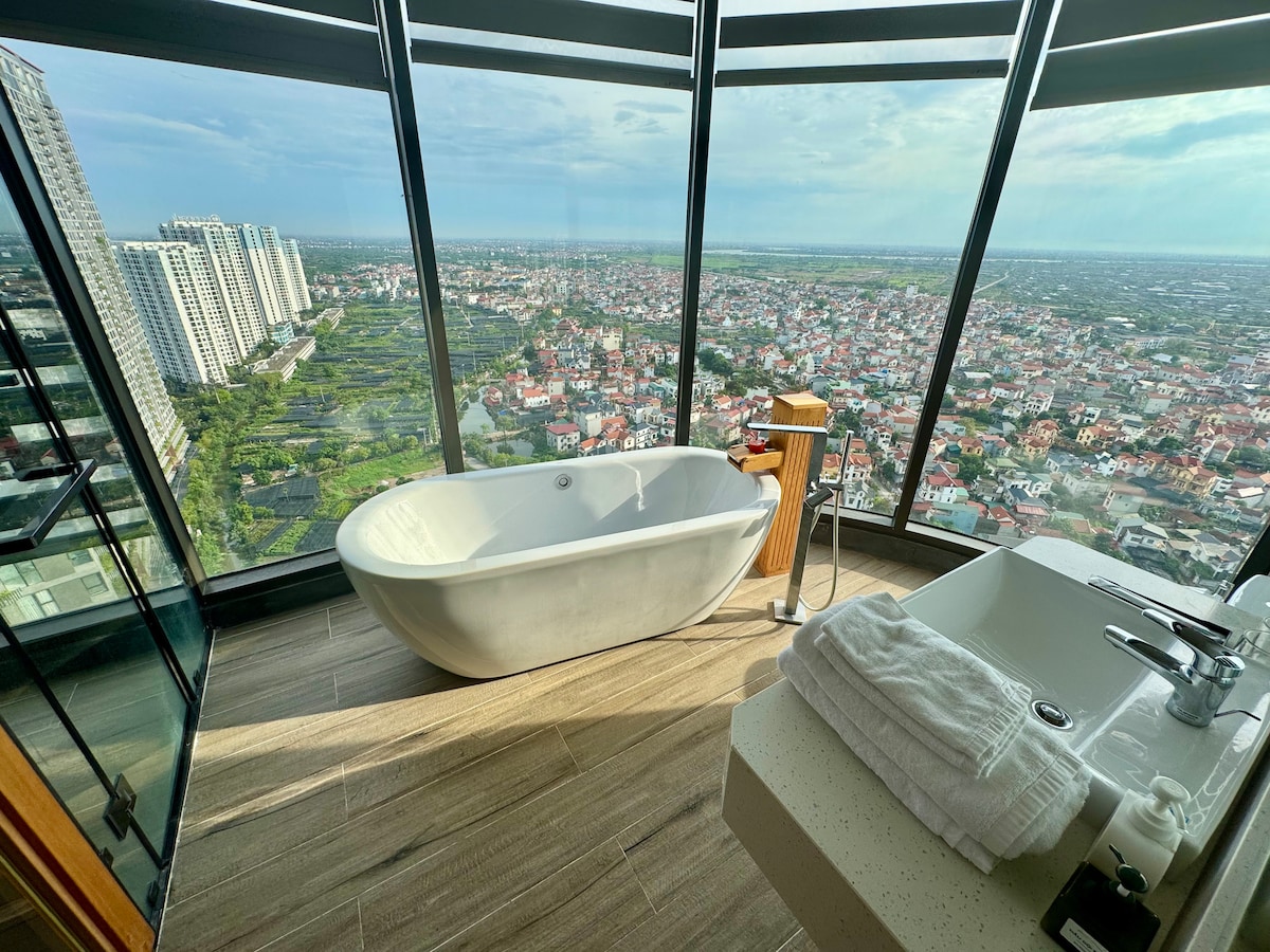 Welcome to Ecopark– Luxury Onsen Landmark Apt - Style: 3 bedrooms perfect for couples, families & groups. - Full Amenities: 2 big bathrooms, modern kitchen, washer, dryer, A/C & Wi-Fi. - Comfort: Private sauna, Stunning panorama lake view bath tub, smart TV, cinema projector, working desk. - Convenience: Elevator, 24/7 security - Prime Location: Located in Swan Lake, golf & Japanese park, the heart of Ecopark. Surrounded by cafes, restaurants & stores…Only about 30 mins to Hanoi city center.