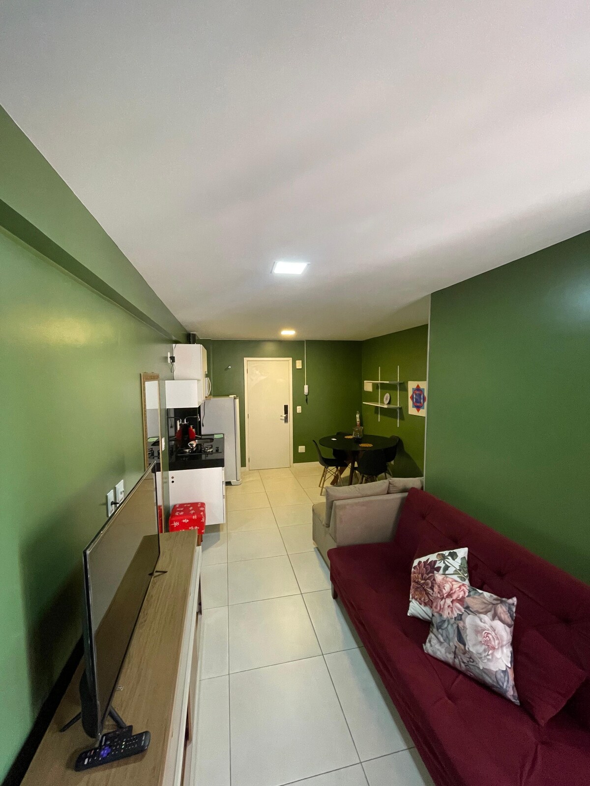 Apartamento-estúdio aconchegante situado na Ponta Verde, bairro nobre de Maceió. Localizado à 300m da praia, 650m da feirinha de artesanato da Pajuçara, 1,8km das piscinas naturais de Maceió e próximo a bares, restaurantes, supermercados e shoppings, está no coração de Maceió. O estúdio inclui Smart TV, wifi e banheiro privativo com chuveiro, secador de cabelo e ferro elétrico, enquanto a cozinha tem micro-ondas, geladeira, fogão, cafeteira ,sanduicheira, panelas,pratos, xícaras, taças vinho.
