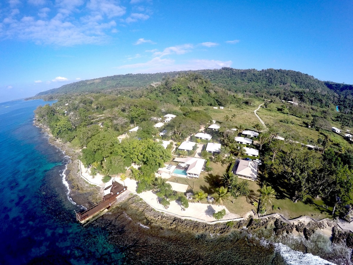 Escape to a private and tranquil retreat. Oceanside bungalow, a charming private self contained bungalow set amidst 4 acres of lush landscape at Island Magic Resort. 15 minutes from Port Vila, yet secluded from the city's hustle, offering a serene getaway in a stunning natural environment. Embrace peace or adventure - Step out to the breathtaking coral reef just steps away incredible snorkelling, via the jetty. Unwind by the pool, savoring cocktails and delicious meals at Birdies Bar & Kitchen.