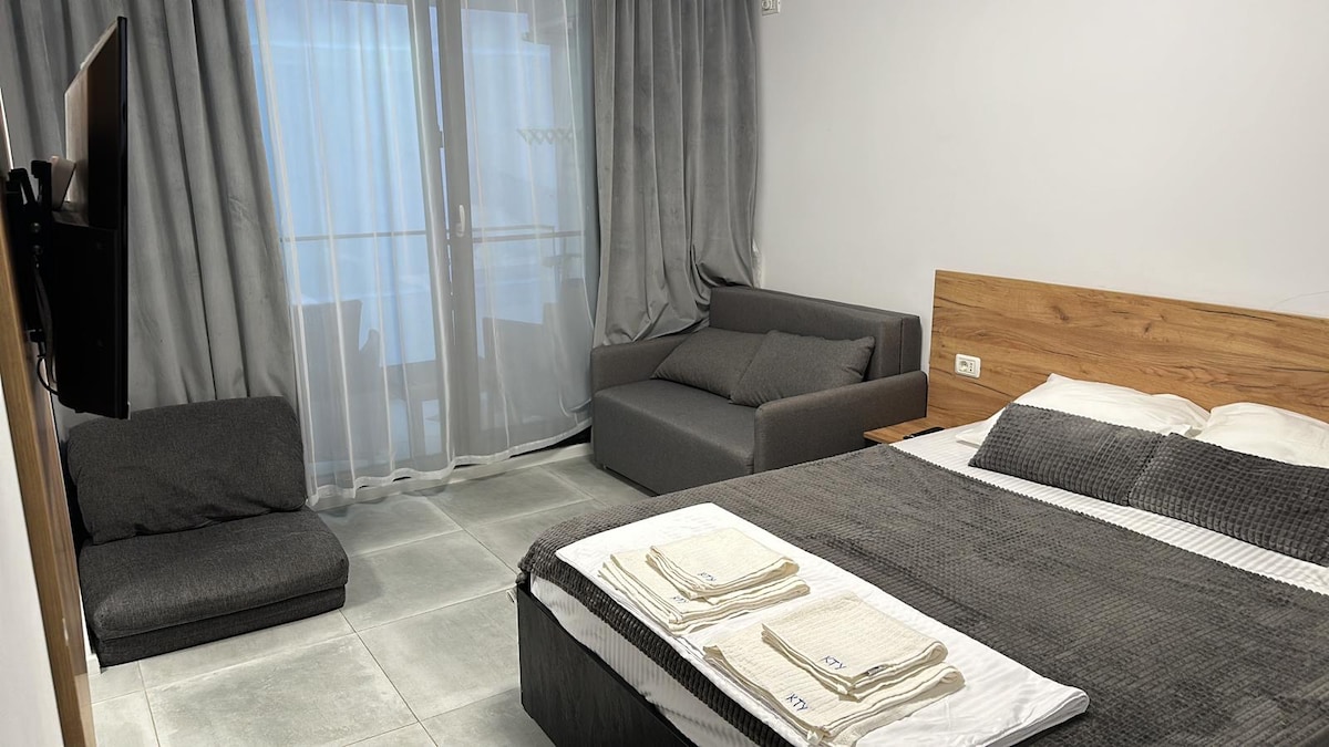 Bright and newly renovated studio, perfect for a relaxing holiday in Eforie Nord. Located near Techirghiol Lake and just a 15-minute walk from Belona Beach, it offers a modern private bathroom, fully equipped kitchenette (electric hob, fridge, coffee machine) and a washing machine. Ideal choice for couples or families, close to restaurants, shops, and main attractions.