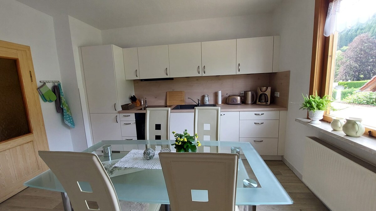 Entspanne dich im stilvollen und ruhigen Haus am Waldrand im UNESCO Biosphären Reservat, unweit des Rennsteiges (2 km entfernt). Haus ist modern und komplett eingerichtet mit Wohnzimmer inklusive Kamin, Sofa, Tisch, TV. Wohnküche mit Induktionsherd, Geschirrspüler und Waschmaschine befindet sich ebenerdig. Außerdem lohnt es sich, bei schönem Wetter auf der Terrasse mit herrlichem Weitblick zu frühstücken/grillen. Schlafraum (1,60 m Bett), Sofa sowie Arbeitsplatz (schnelles WLAN) und Ausblick.