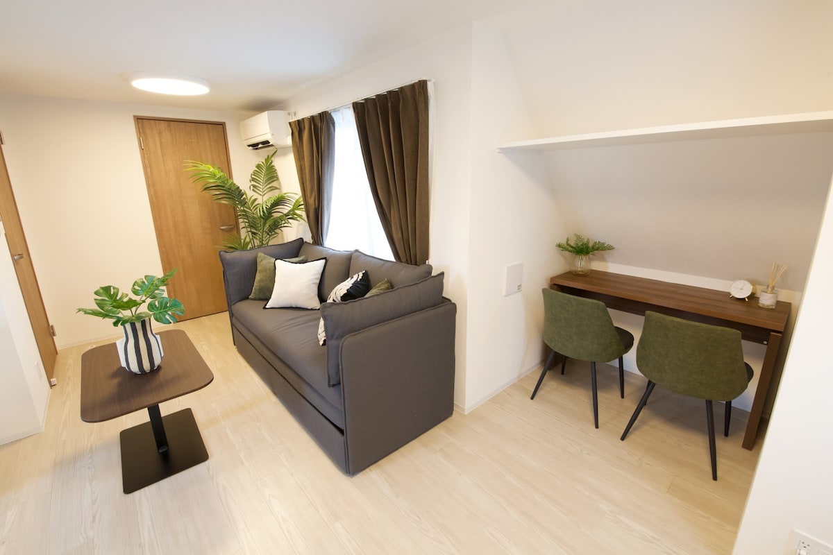 全新高質感整套公寓|步行7分鐘到新江古田站|直達新宿 本公寓位於都營大江戶線新江古田站步行7分鐘, 是一間全新落成、設計簡約而富有質感的整套私人公寓。 全室包租,提供安靜、私密且舒適的居住環境,特別適合重視品質與細節的旅客。 交通便利,12分鐘即可直達新宿,前往池袋、六本木等核心地區亦相當順暢。 無論是高端旅遊、商務出行,或中長期停留東京,都能兼顧效率與生活品質。 室內設有附鏡子的專屬工作空間, 適合遙距辦公、線上會議,也方便整理儀容。 寬敞的客廳配置沙發、電視與餐桌,空間開闊, 沙發床將依入住人數事先鋪設,讓您一抵達即可放鬆身心。 廚房配備完整且實用的烹飪用具, 即使身在旅途中,也能享受優雅而從容的用餐時光。 另備有空氣清新機及兒童用餐坐墊, 讓家庭旅客或對環境要求較高的客人,也能安心入住。 臥室設有高品質 King Size 大床, 為您帶來深層放鬆與安靜舒適的睡眠體驗。 從車站至公寓的道路平坦,攜帶大型行李亦十分輕鬆, 大樓設有電梯,出入便利而優雅。 希望這裡能成為您在東京,願意一再回訪的靜謐居所。