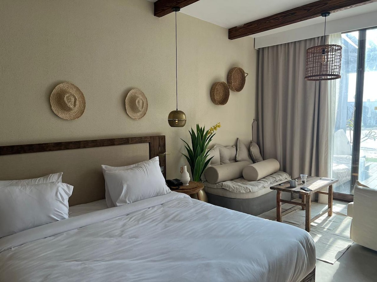 Stunning modern suite featuring a king bed, private terrace, and immediate beachfront. Contemporary design with tropical touches, premium amenities, Perfect getaways, and beach lovers seeking privacy and elegance. Steps to pristine white sand and crystal-clear waters with Beach Access for three people maximum.