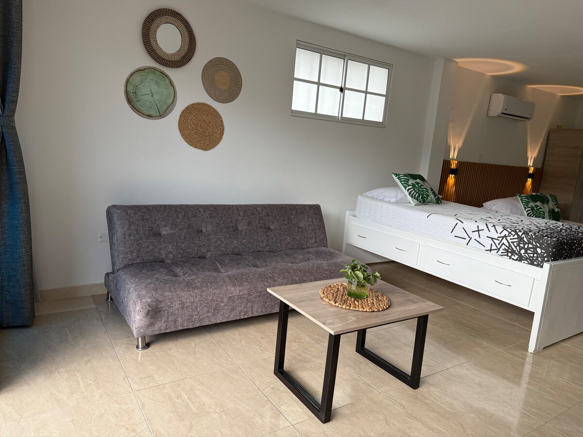 在參觀美麗的卡利市時,感受如家一般的舒適。這是一間豪華套房,配備您享受愉快時光所需的一切,位於安靜的高級社區,非常中心,步行即可抵達Parque del Perro。我們非常關注每一個細節。在這裡,您可以找到全套廚房、1間全套浴室、小型辦公空間,還有熱水可供放鬆淋浴。智慧電視可供娛樂、WiFi等。我們真的希望您能感到賓至如歸!