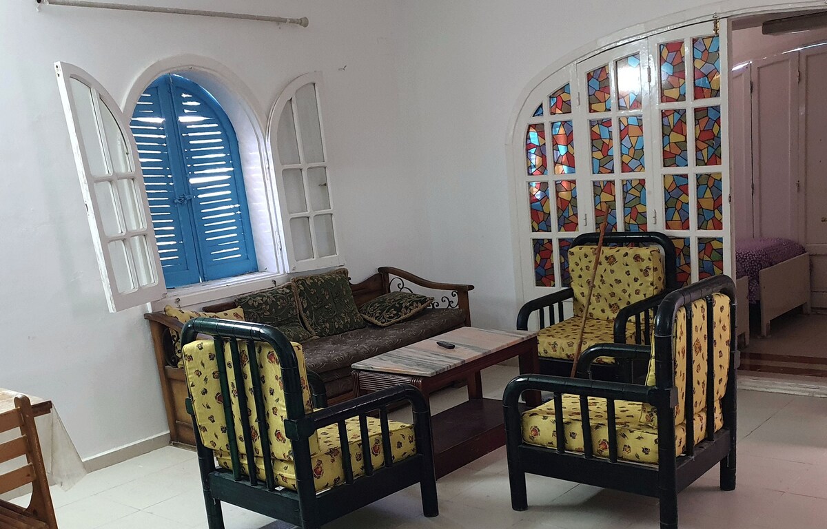 與親朋好友一起在這間令人驚豔的海濱優雅房源玩得開心。這是一個三居室小木屋,旨在為您提供驚人的獨特體驗。在私人花園中享受舒適的下沉座位區,距離美麗的地中海清澈海水僅幾步之遙。是🌊 ✨ 時候創造特殊的回憶了! 🏖️ 🇪🇬