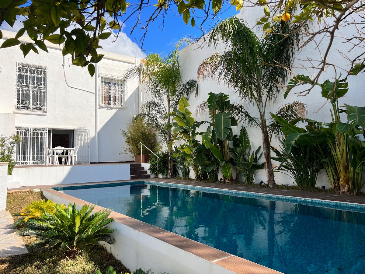 歡迎來到我們迷人的單間公寓,可欣賞泳池和美麗花園的驚人景觀。 我們的單間公寓位於安靜的地區,非常適合放鬆身心。 這間獨特的住宿靠近突尼斯市中心的所有景點和所有設施,讓您輕鬆規劃旅程。 -高速網路連線 -可使用泳池和鬱鬱蔥蔥的花園 - 4K QLED電視 -洗衣房(洗衣機)
