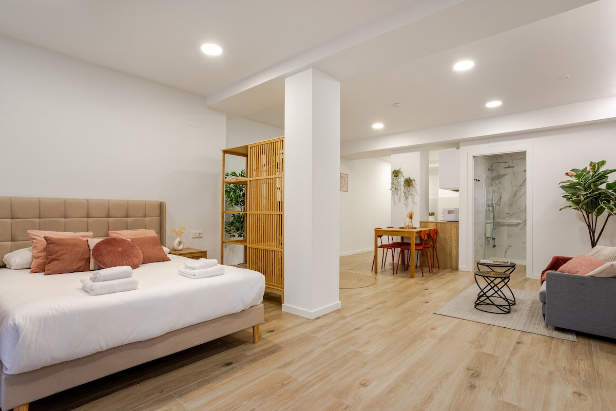 時尚的 56 平方公尺單間公寓,配有雙人床和 25 平方公尺露臺,非常適合一人、兩個朋友或情侶入住。 位於安靜但中心的區域。步行10分鐘即可抵達Russafa ,您可以在那裡找到所有時髦的咖啡廳、商店和酒吧。步行2分鐘即可抵達Turia Gardens ,在那裡您可以欣賞到未來的藝術與科學城建築,步行或騎自行車9公里的綠地,環繞舊城區。步行約20分鐘即可抵達舊城區。乘坐巴士可輕鬆前往海灘。