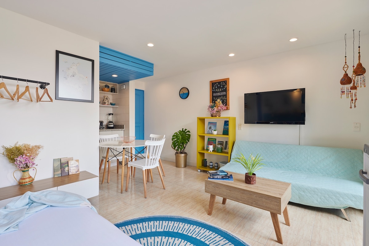 这间美丽的工作室设备完善,地理位置优越,是在麦德林的一个难忘的逗留。 它位于离LLeras公园5分钟车程的地方,在一个有24小时门卫服务的住宅里。 这是一个家具齐全的公寓,有一张双人床,一张沙发床,一个设备齐全的厨房,一台洗衣机和一个小阳台。 此外,你可以享受智能电视和Netflix。 互联网连接是100MBPS。